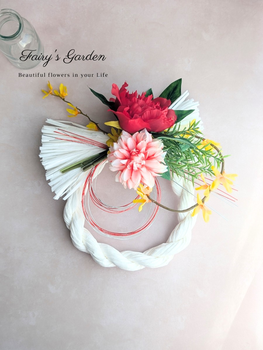 白いしめ縄に合わせて、ちょっぴりガーリーに仕上げました。