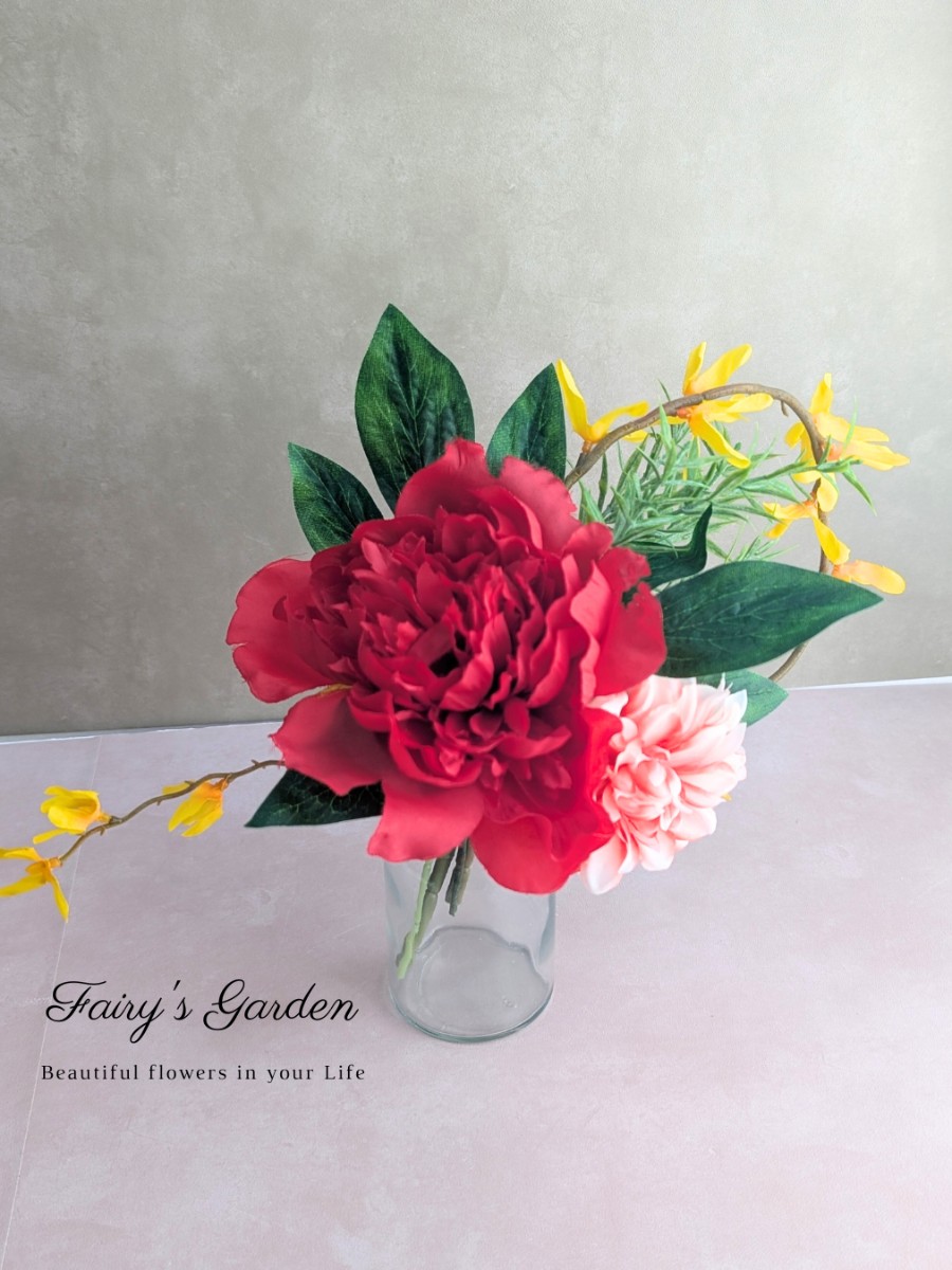 華やかな大輪のピオニーと、可愛らしいダリア。