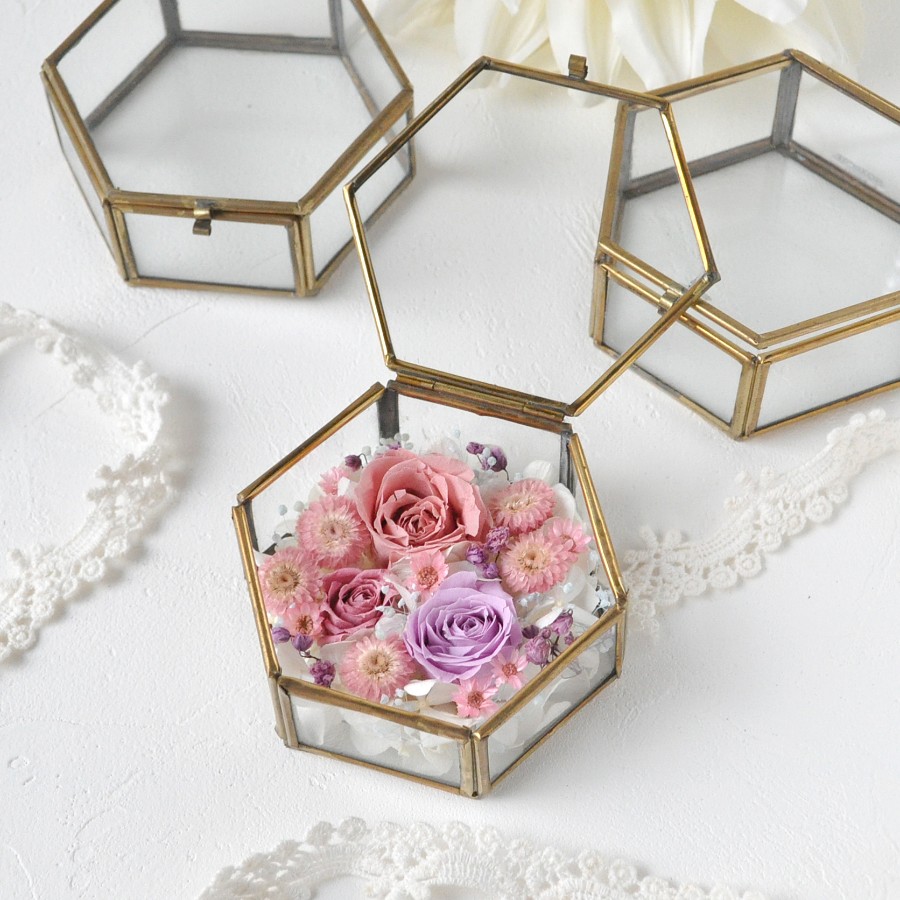 雑貨屋さんで見かけた6角形のガラスの小箱をプリザで飾りました。