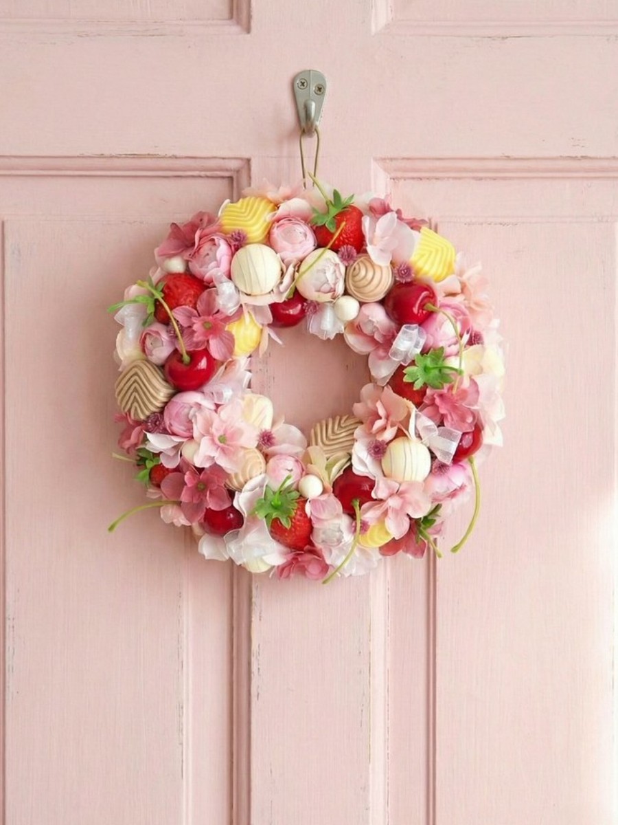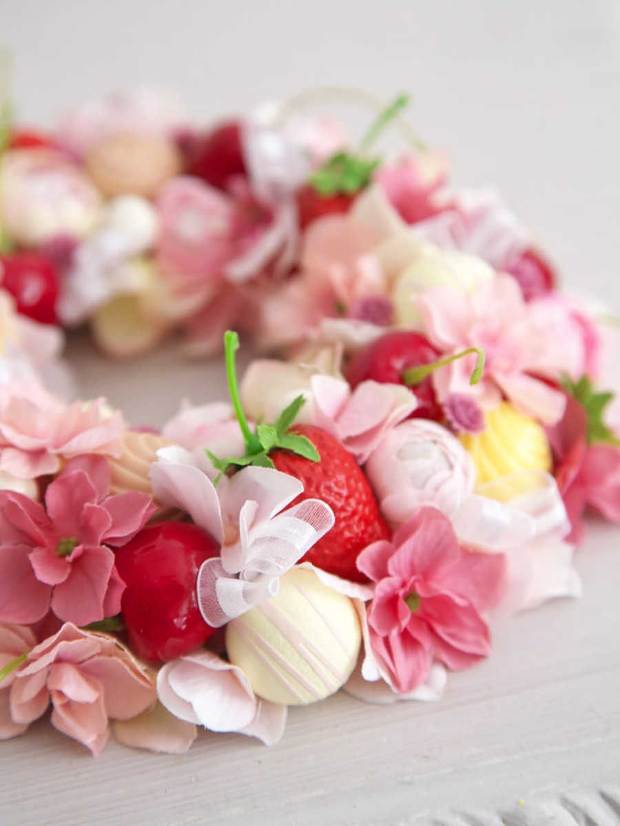 真っ赤ないちごと、つやつやのチェリー、そしてホワイトチョコを、ピンクのお花の中にたっぷりと詰め込みました。