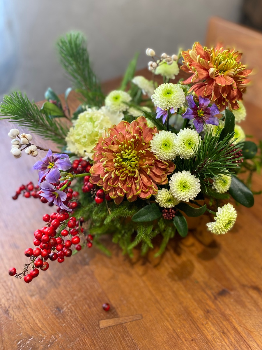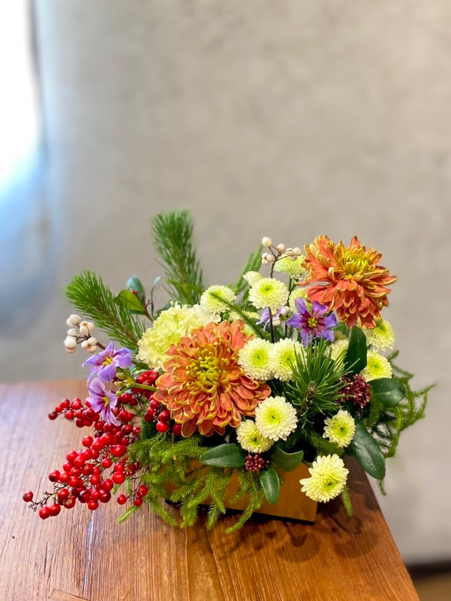 オレンジのマムに白い葉牡丹やピンポンマム、リューココリネを華やかにあしらいました。