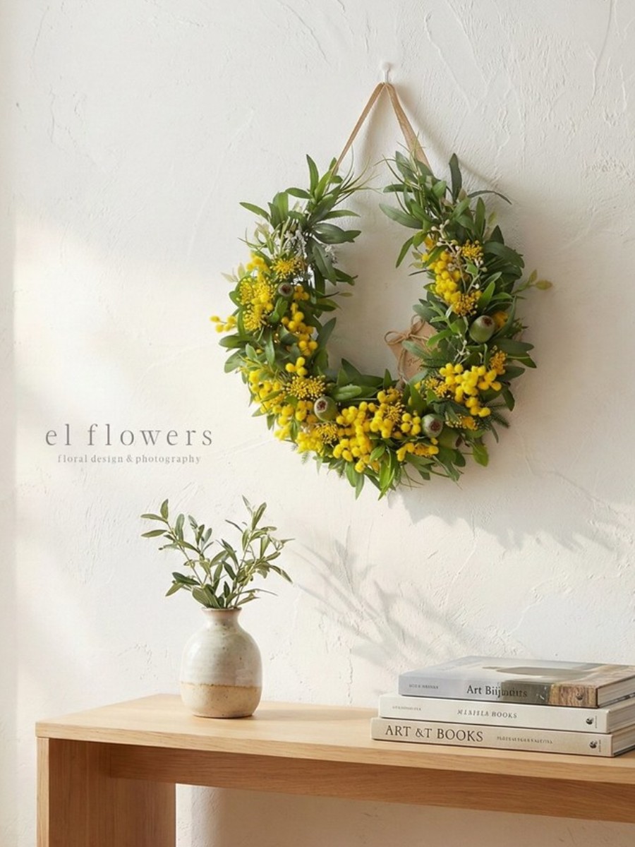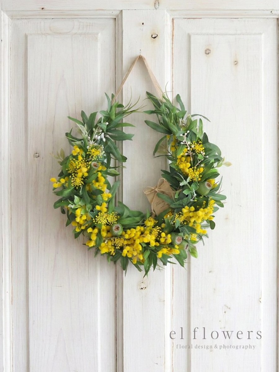 ふわふわと愛らしいミモザを贅沢にあしらい、シックなオリーブの葉と合わせることで、甘すぎない「大人の春色」に仕立てました。