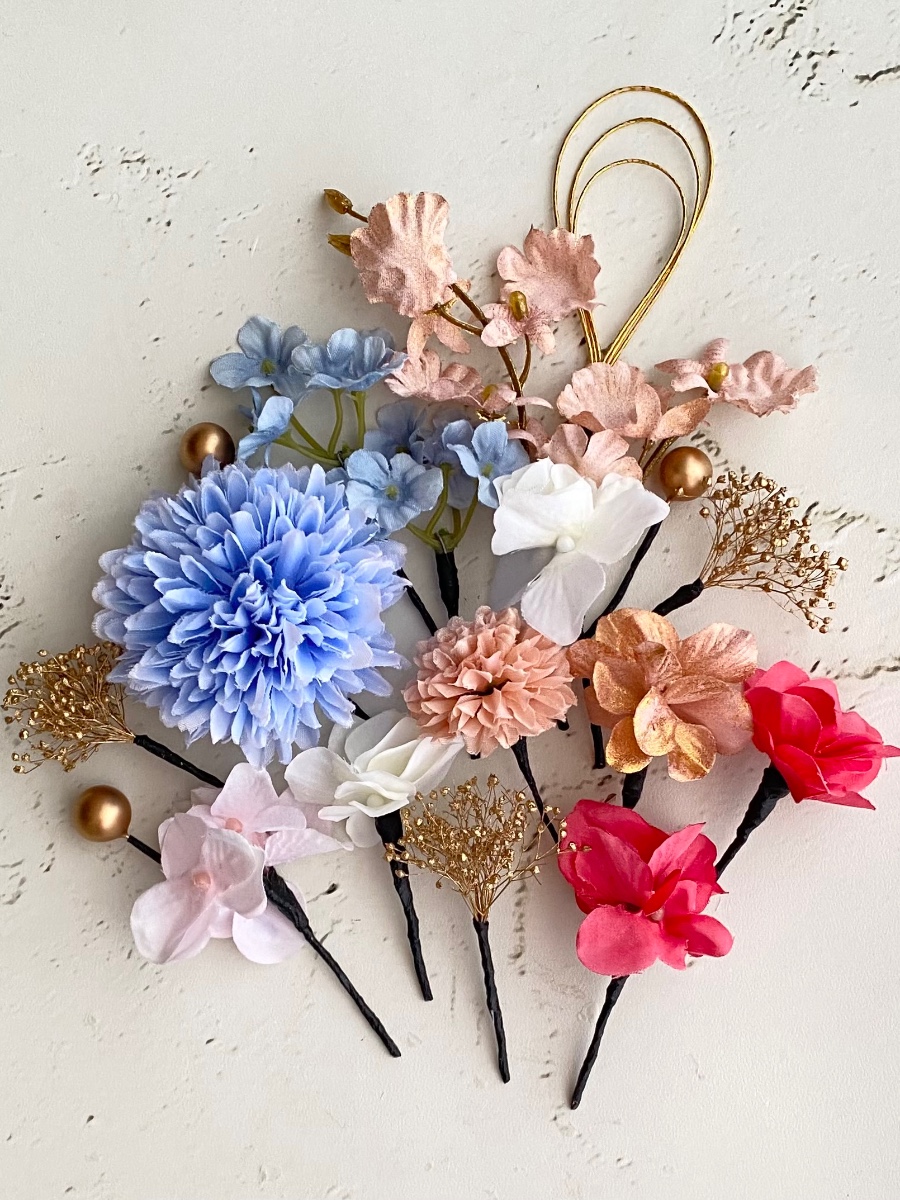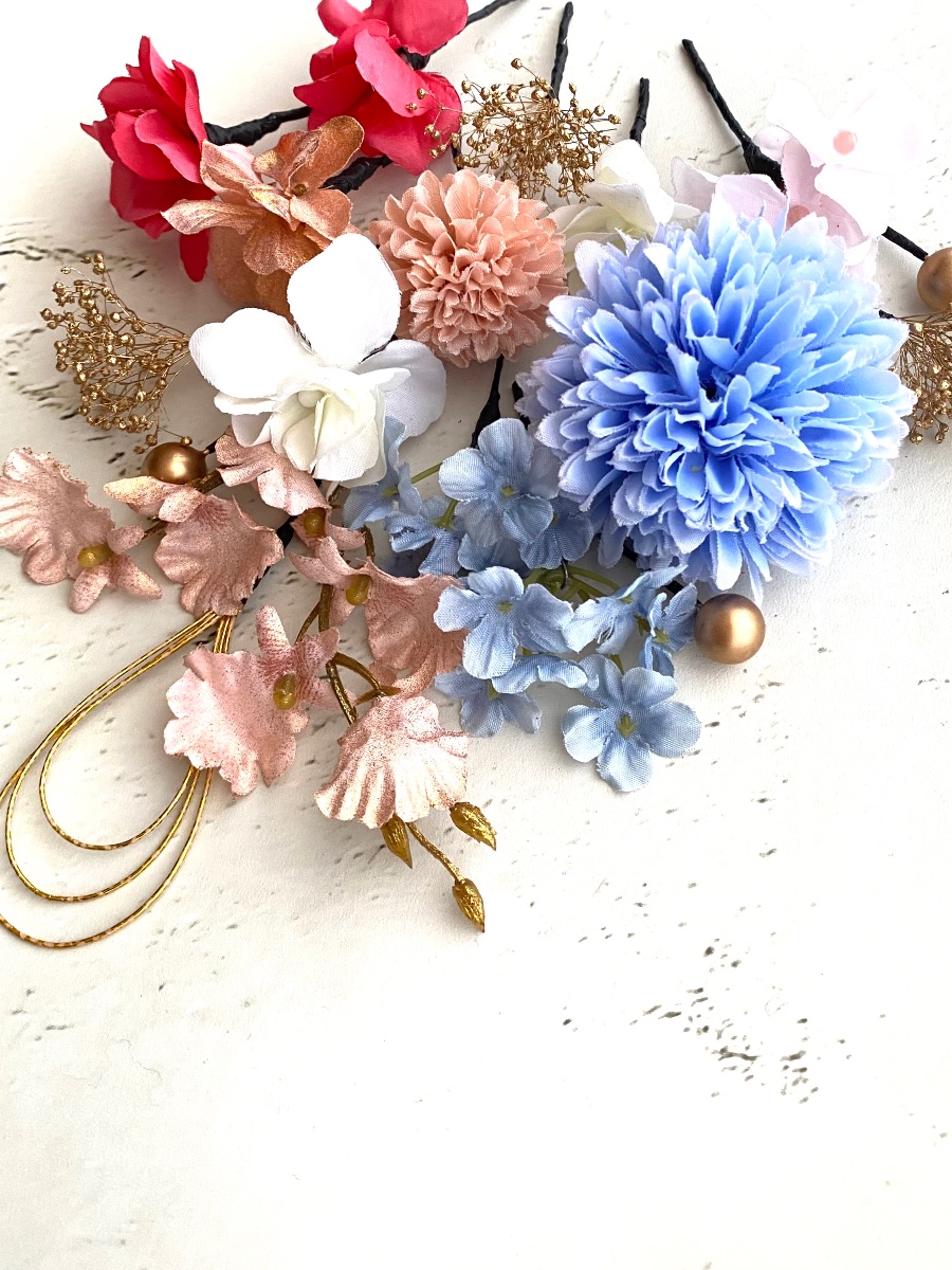 あざやかなブルーのお着物にあわせて、ライトブルー、ピンク、ゴールドを中心にいろんなお花で作りました