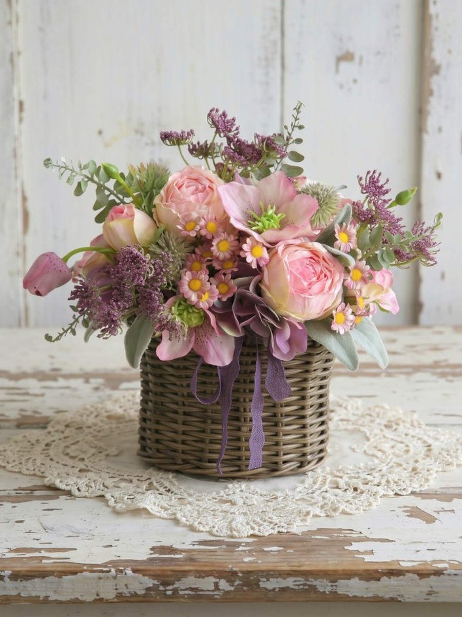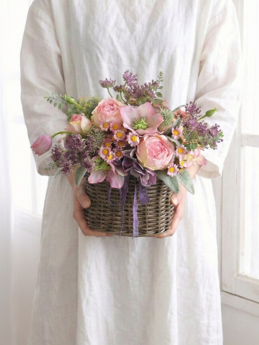 まるで外国の田舎の庭から摘んできたばかりのような、ナチュラルで空気感のあるバスケットアレンジです。