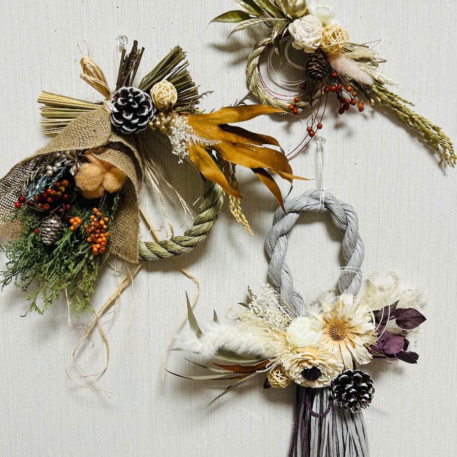 ワイルドフラワーやドライ花材を使ったしめ縄リースです。