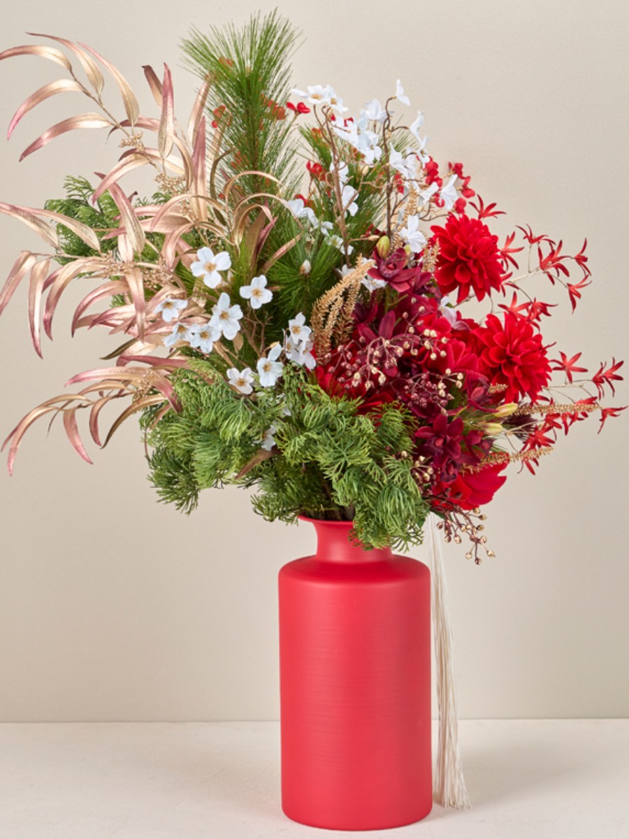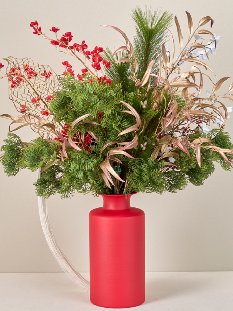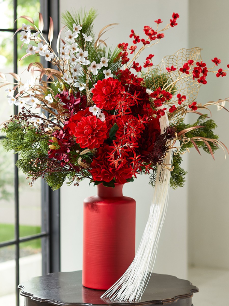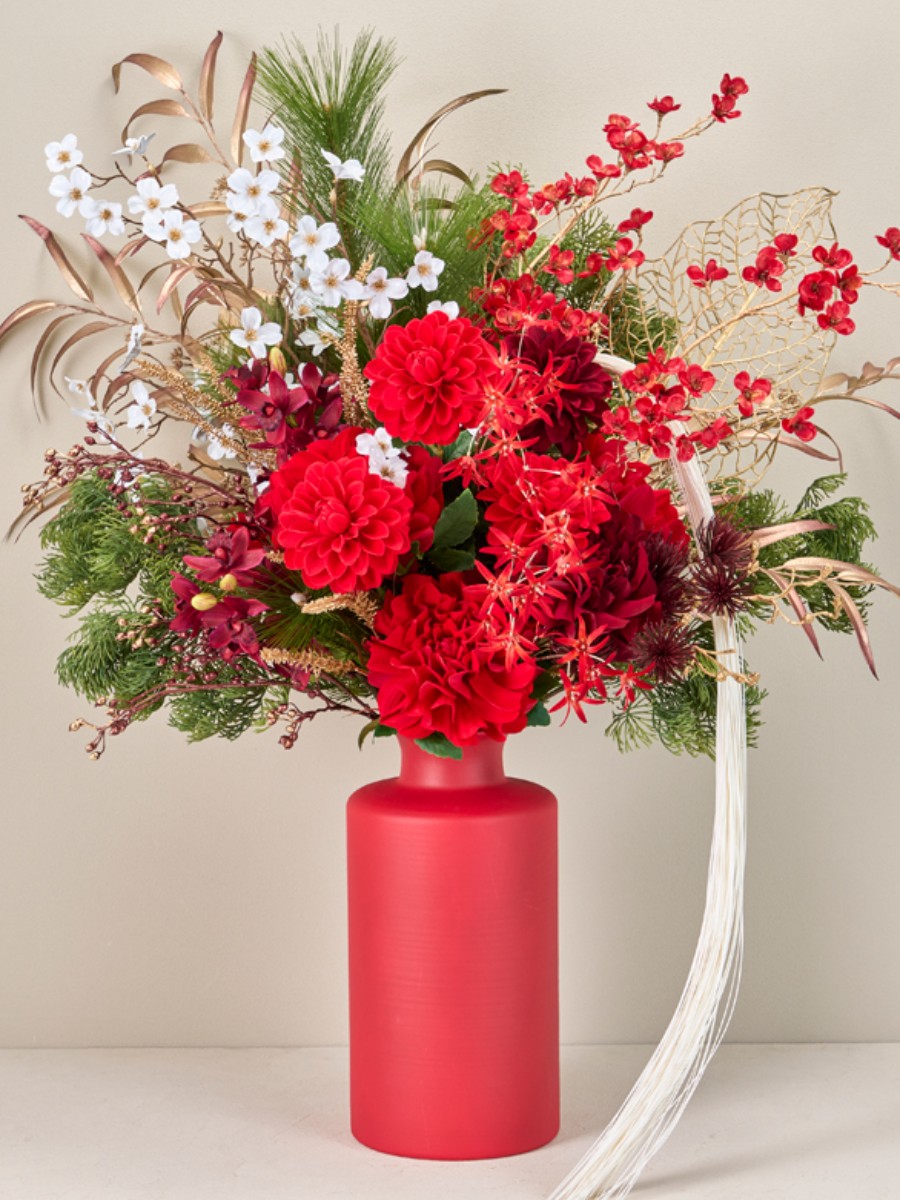 赤の濃淡にゴールドと白をポイントにして、お正月の晴れやかさと華やかさを演出しています。