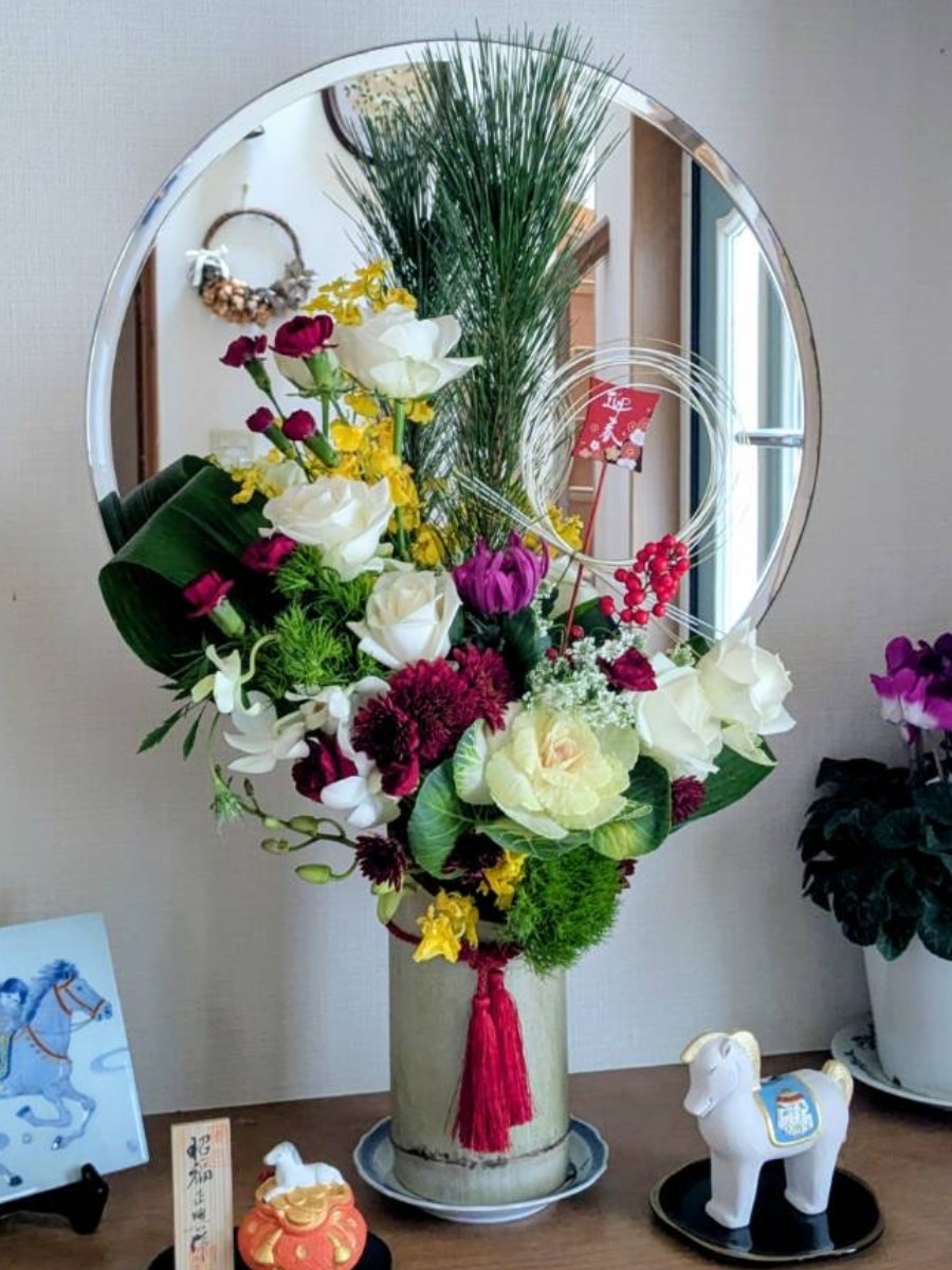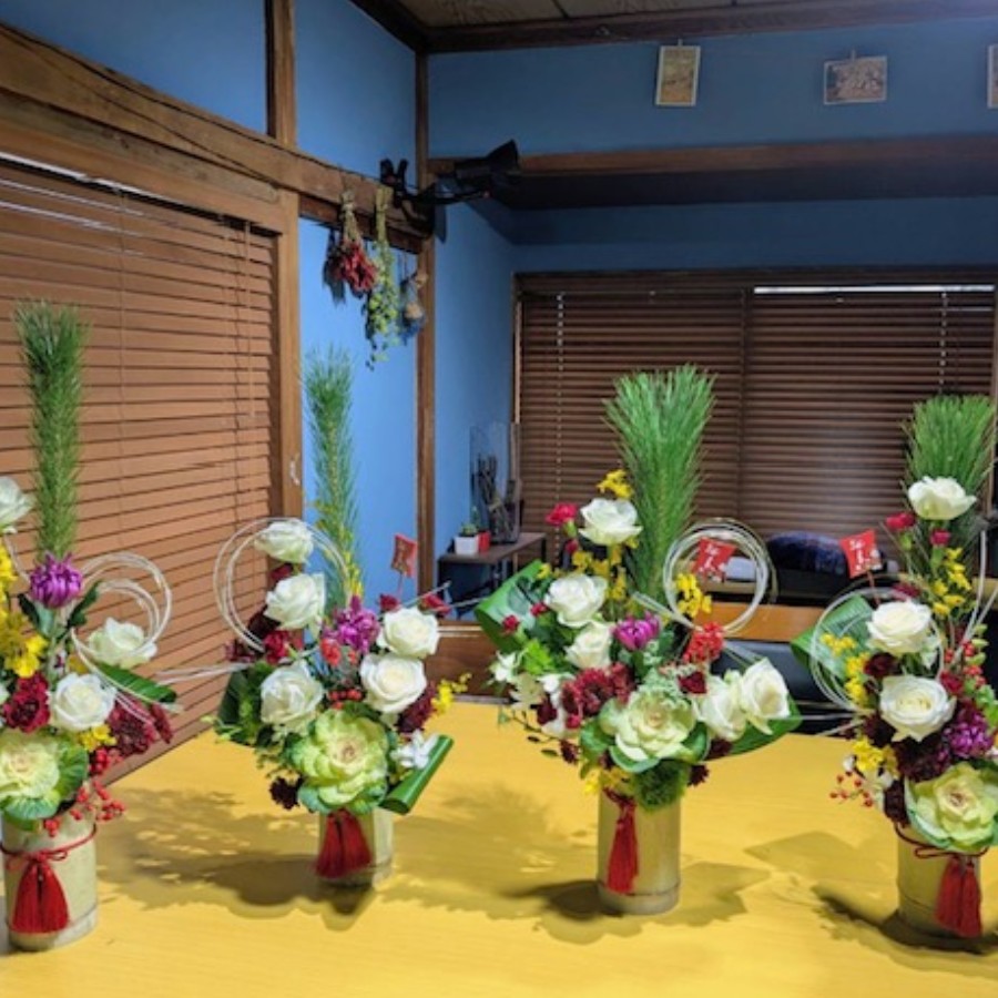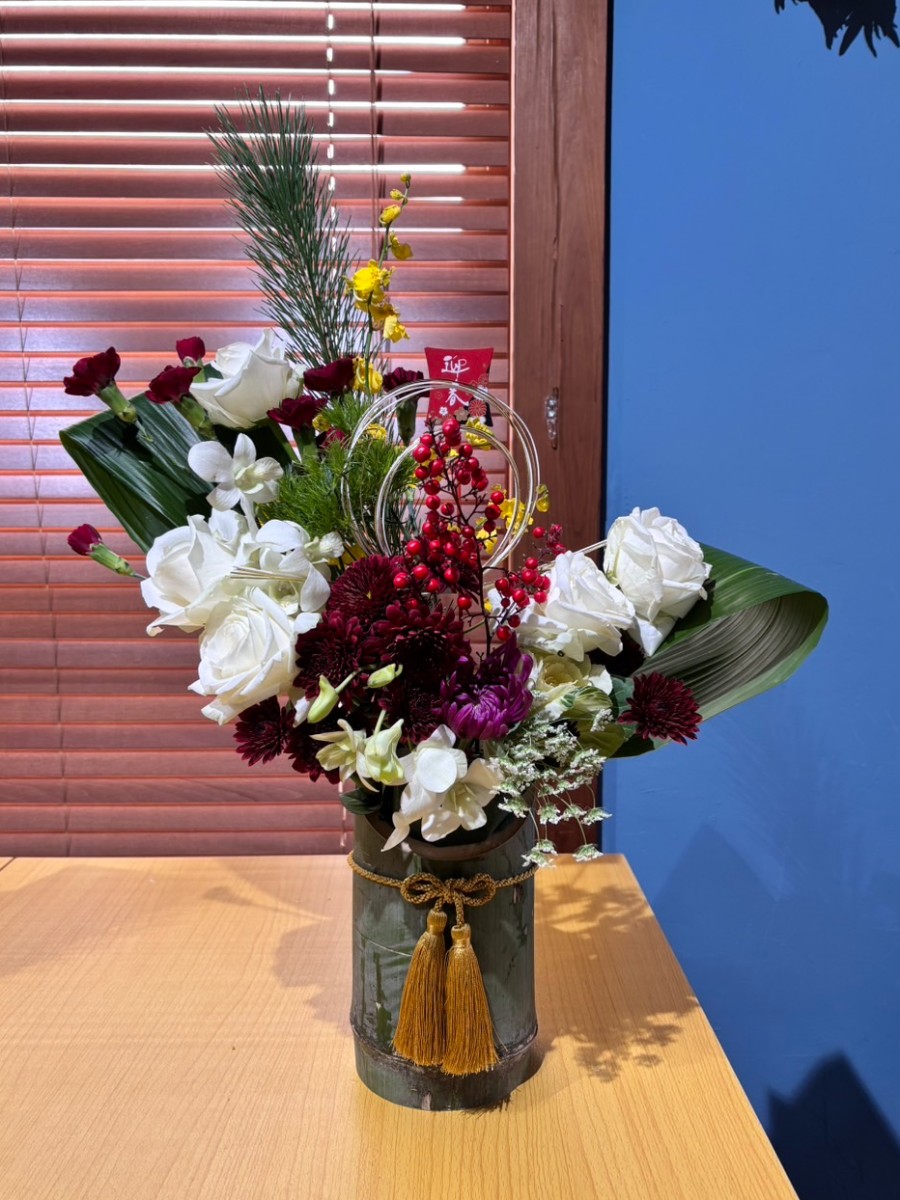 フォーカルポイントに葉牡丹や1輪菊を(花が開くことを考慮して間をあけ)挿し、アバランチェでクレッセントのラインを作りました。