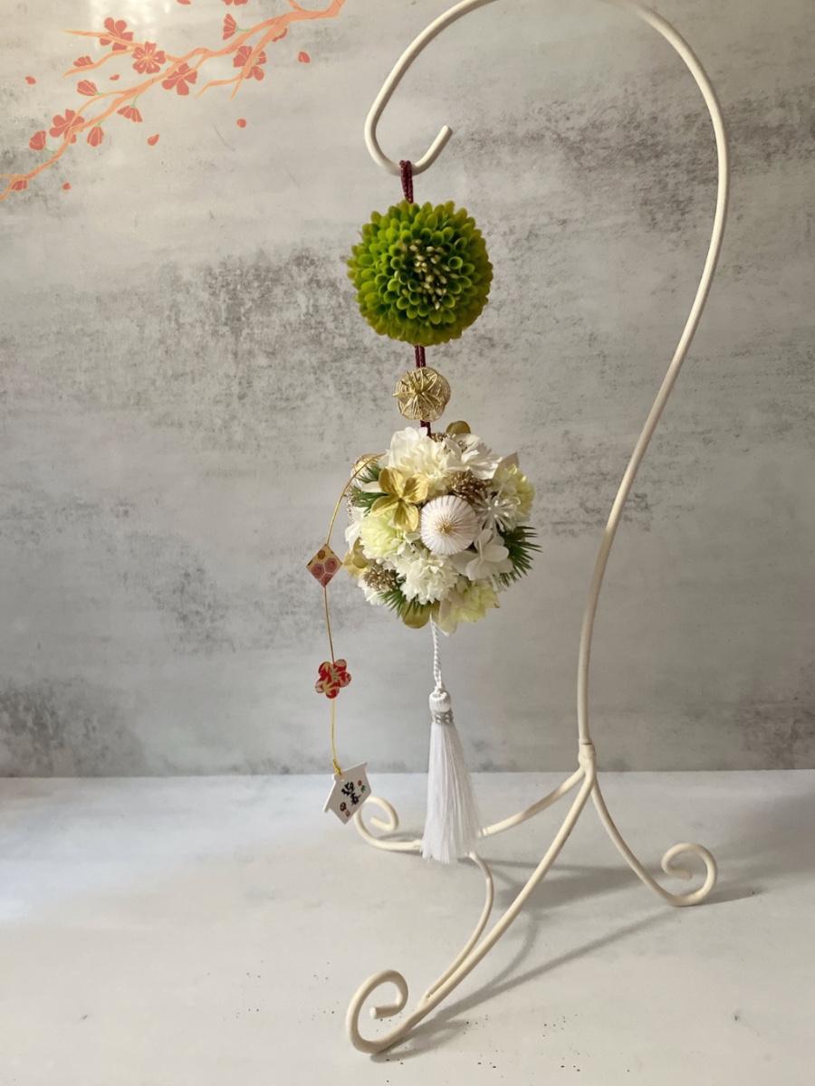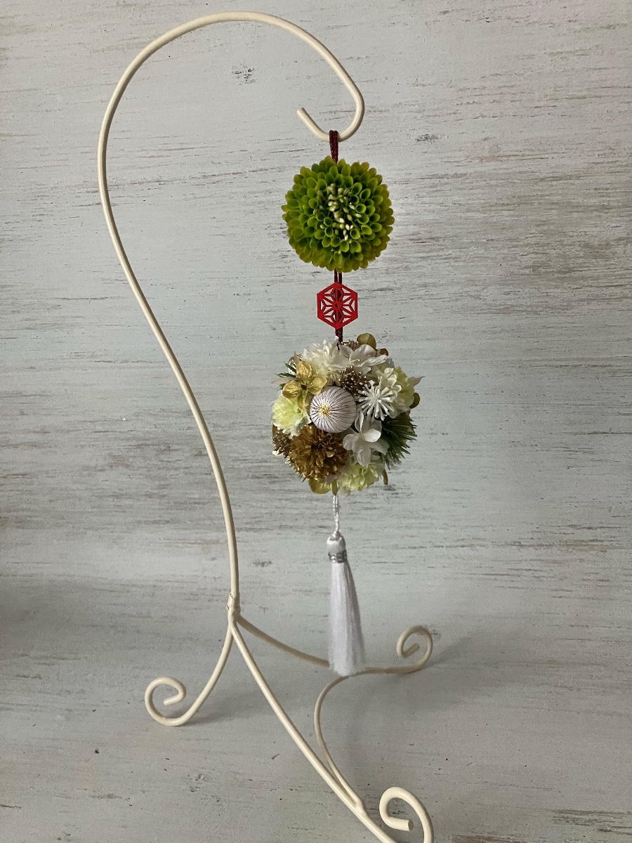 グリーンのマムと、白とゴールド系のボールフラワーです。お正月っぽく、松を入れ、飾りとタッセルをつけました。