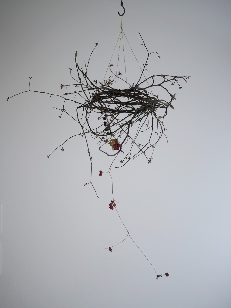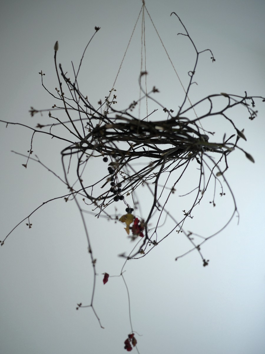 ぷっくりとした花芽のついたクロモジの枝を丸めたシンプルなフライングリースです