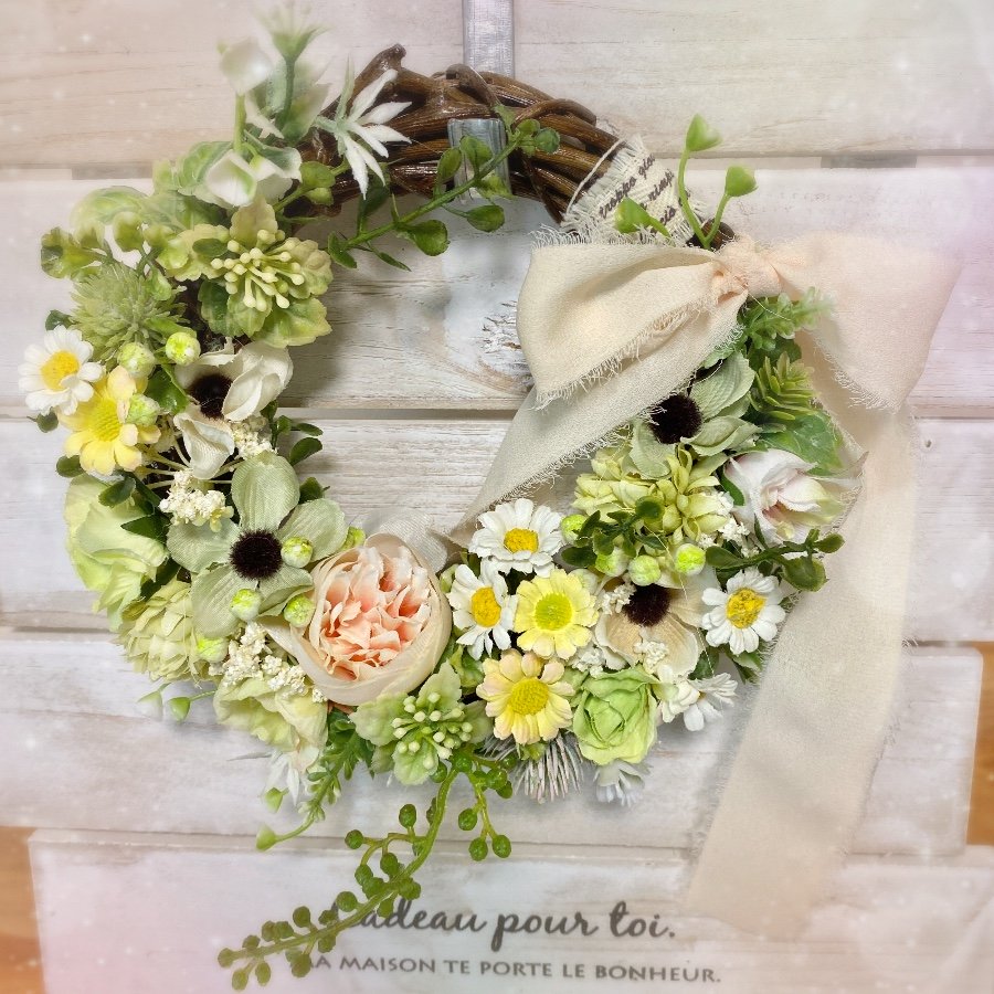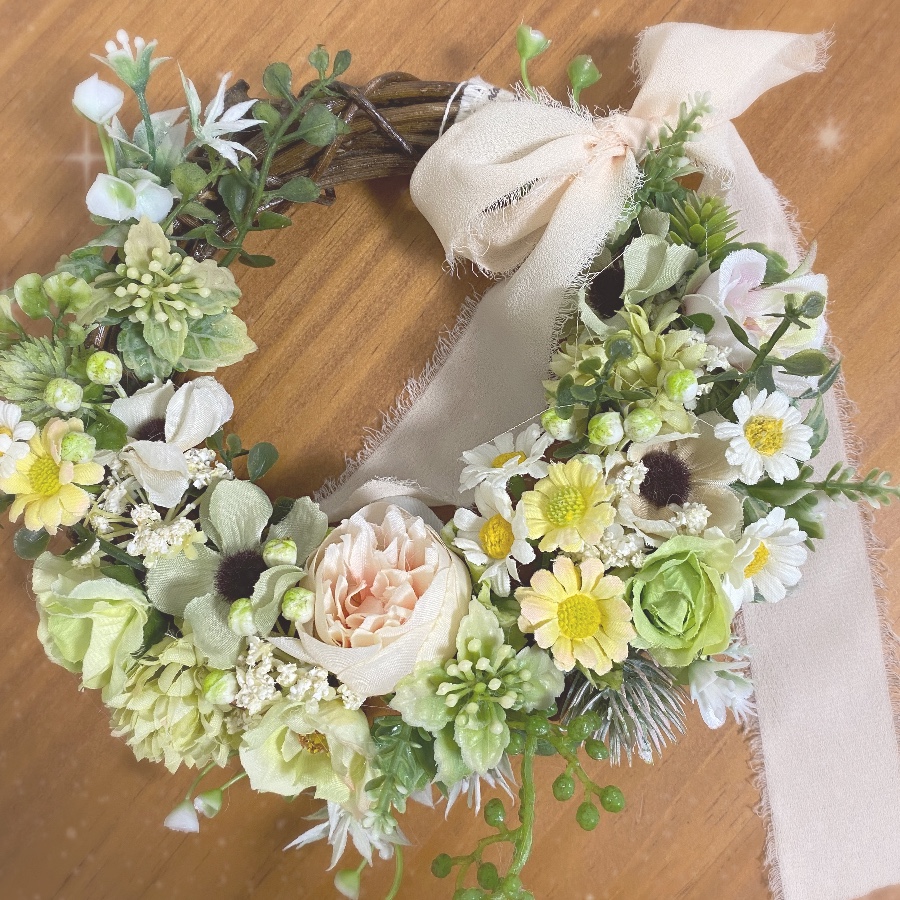 春色の淡いカラーの小花とグリーンのかわいいリースてす。