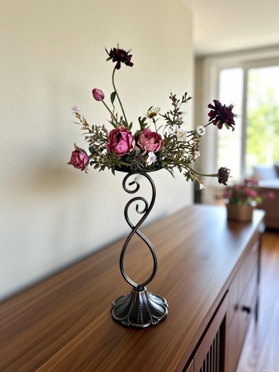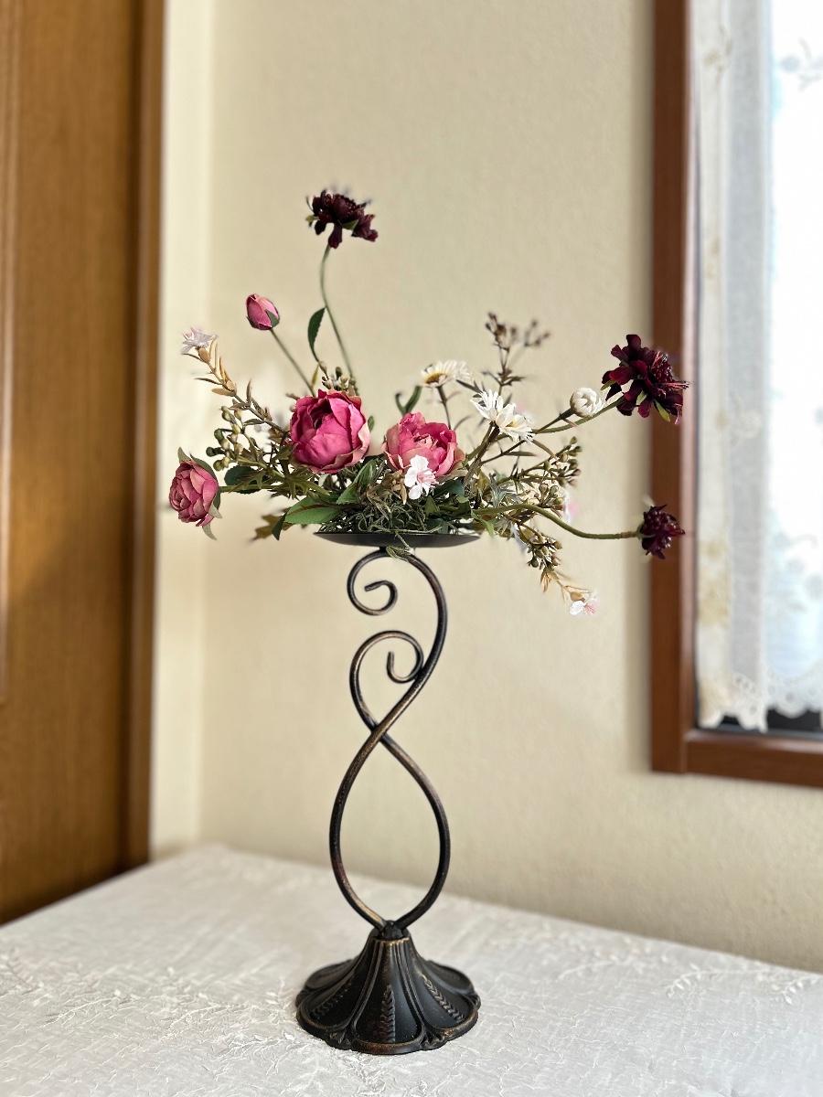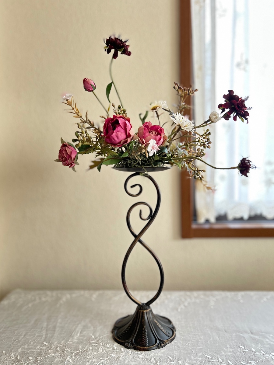 器の皿の部分に小さいフローラルフォームをセットしています。少なめの花材で華やかに見えるよう花材に高低差を付けています。