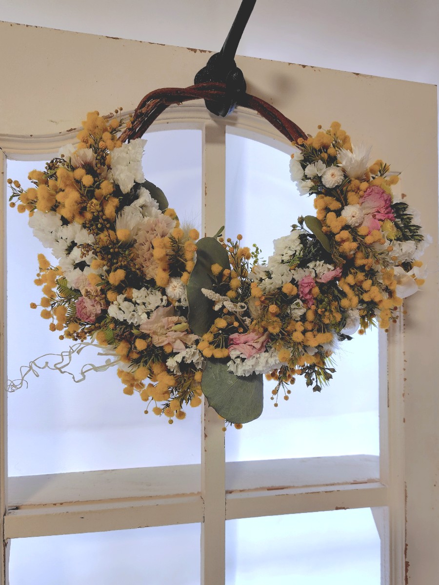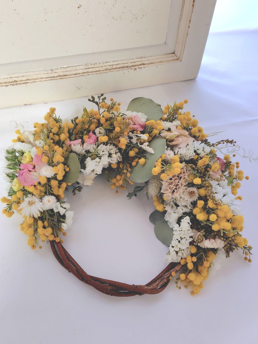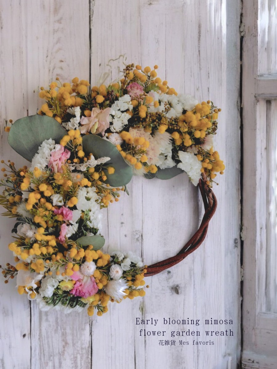 スイートピーやスターチス、ペティーコートなど他の春の花々やグリーンと合わせ、春のお花畑をイメージして作ったリースです。
