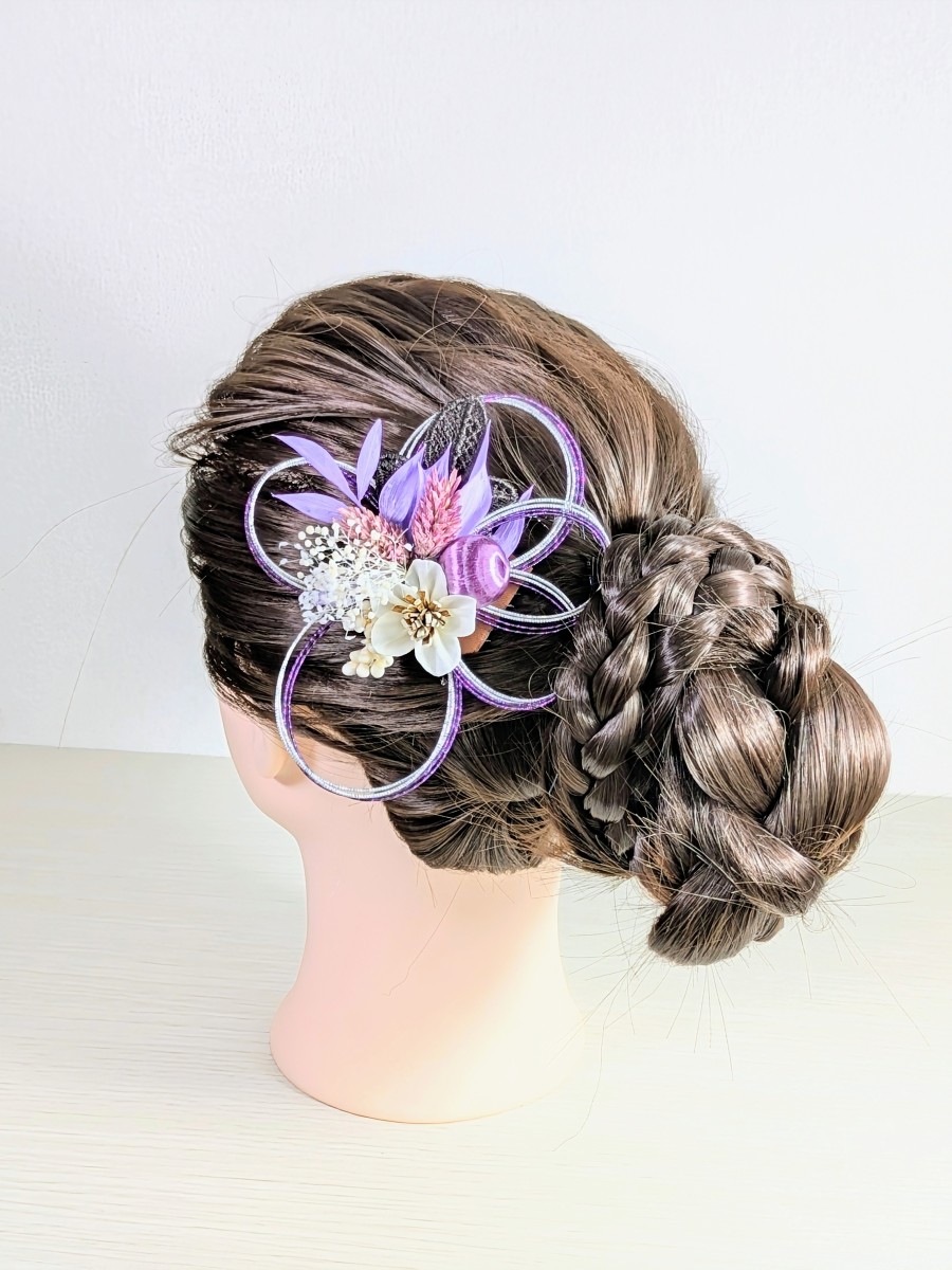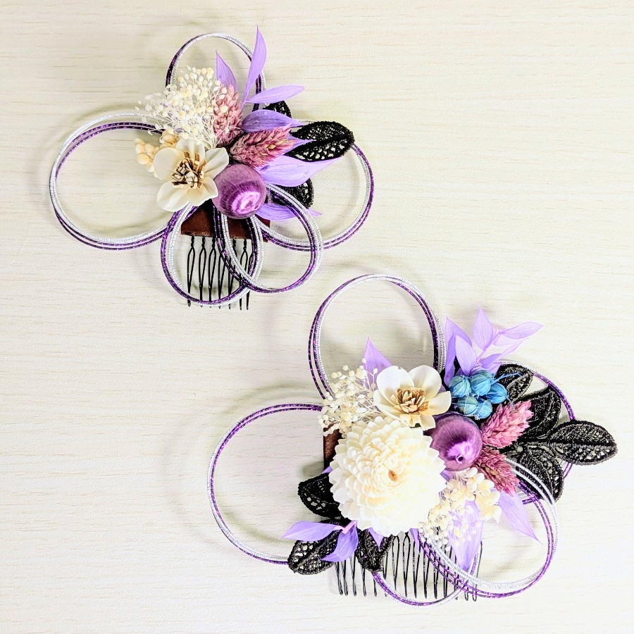 ソラフラワーとドライフラワーの紫の髪飾りセットです。紫で華やかに仕上げました。