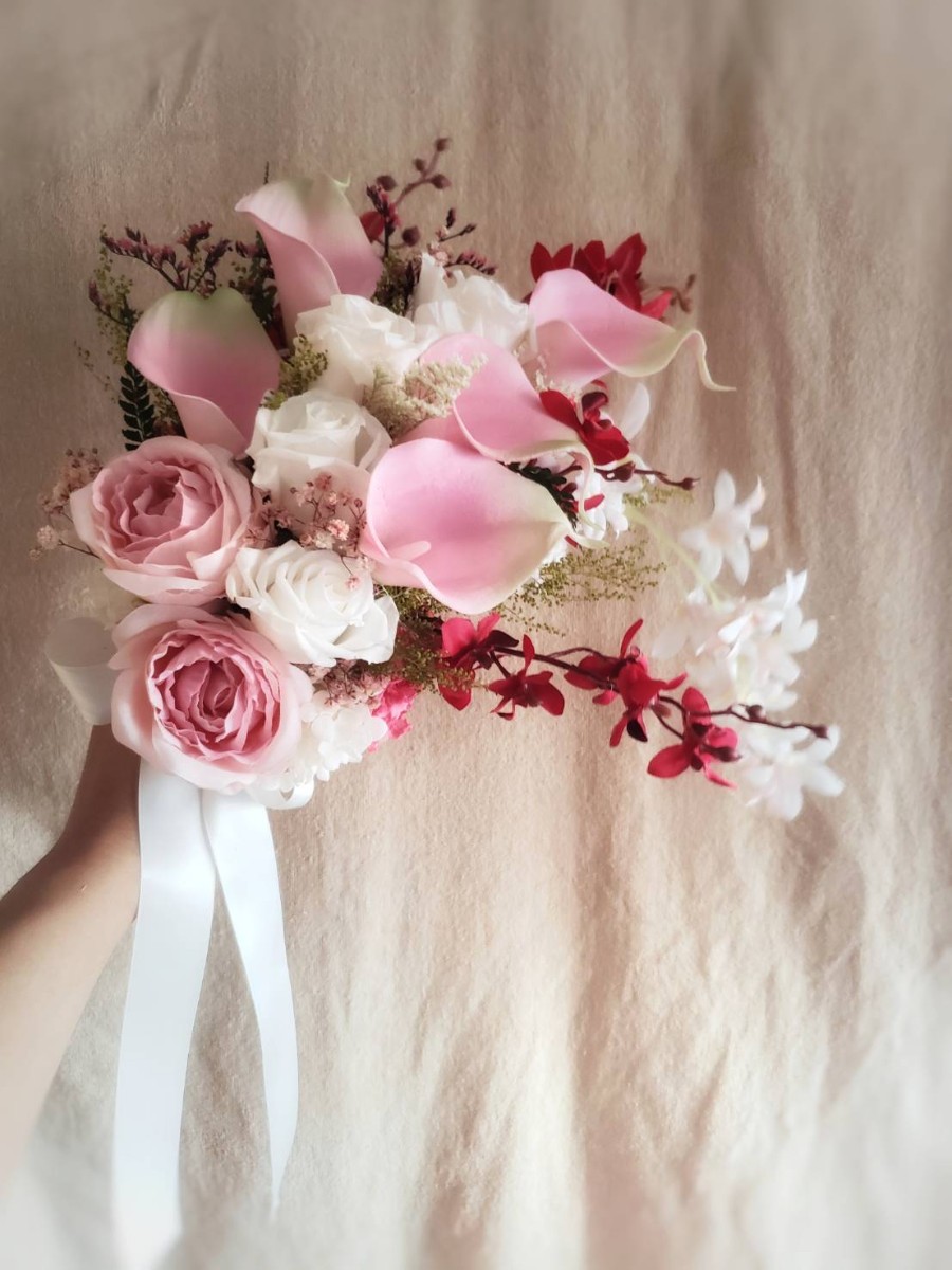 ピンクのバラとカラー、オーキッドを流れるようにアレンジしたクラッチブーケです。