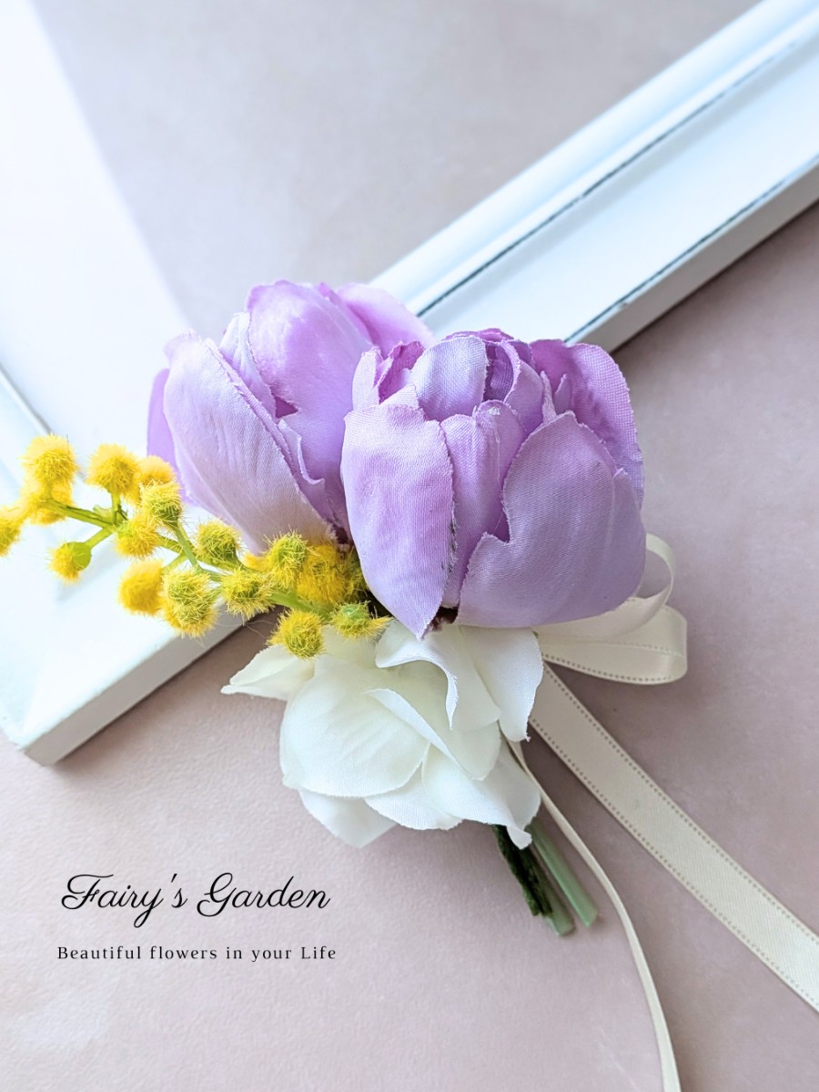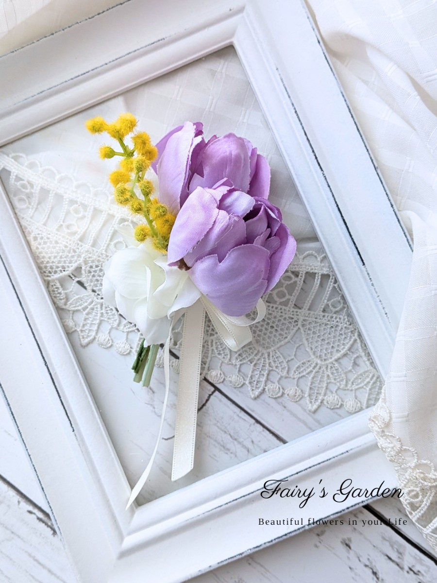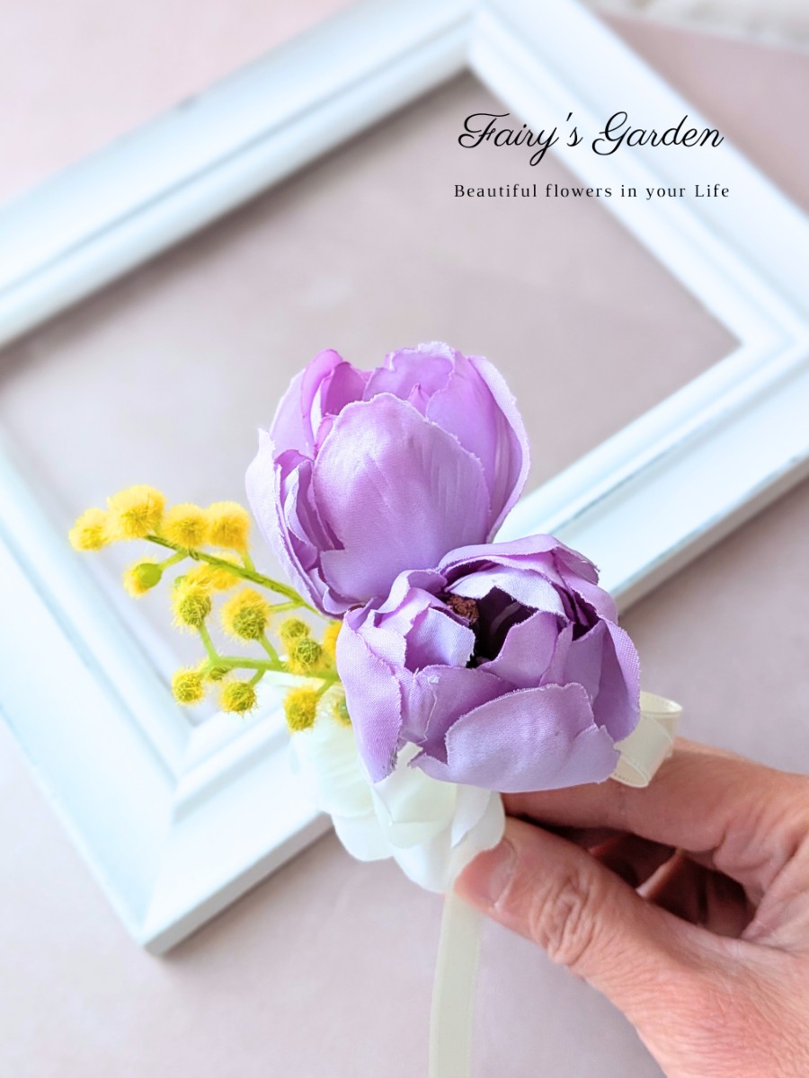 春を代表する花、チューリップとミモザの花束みたいなコサージュです。