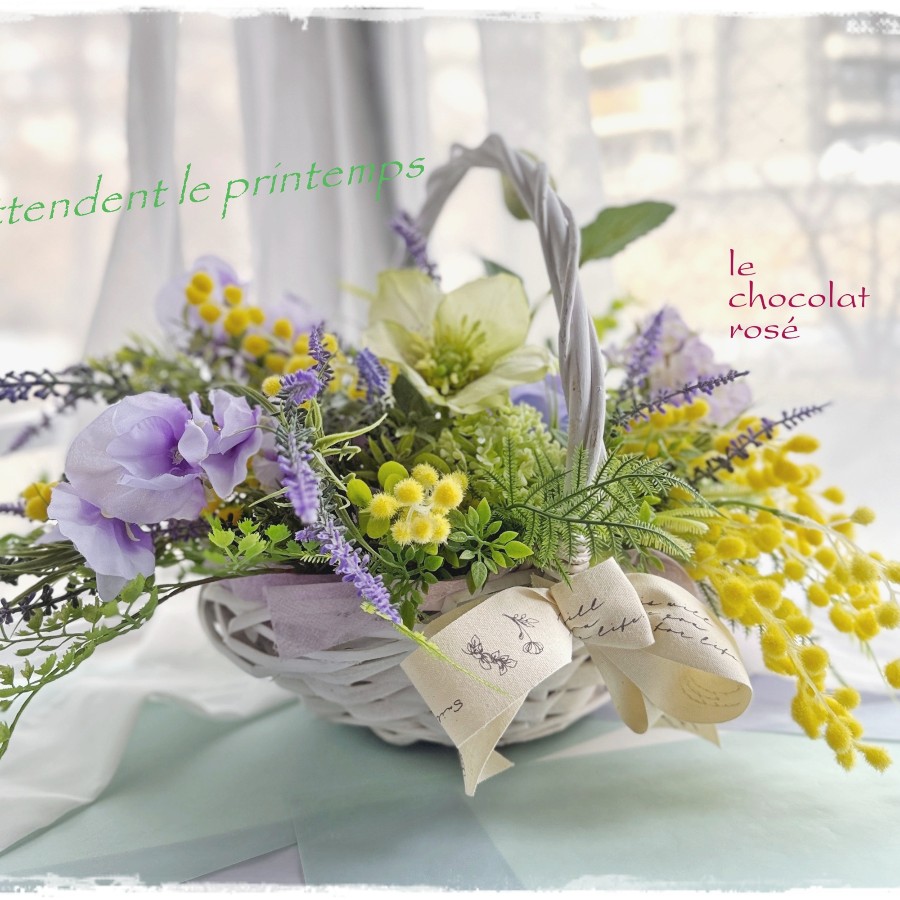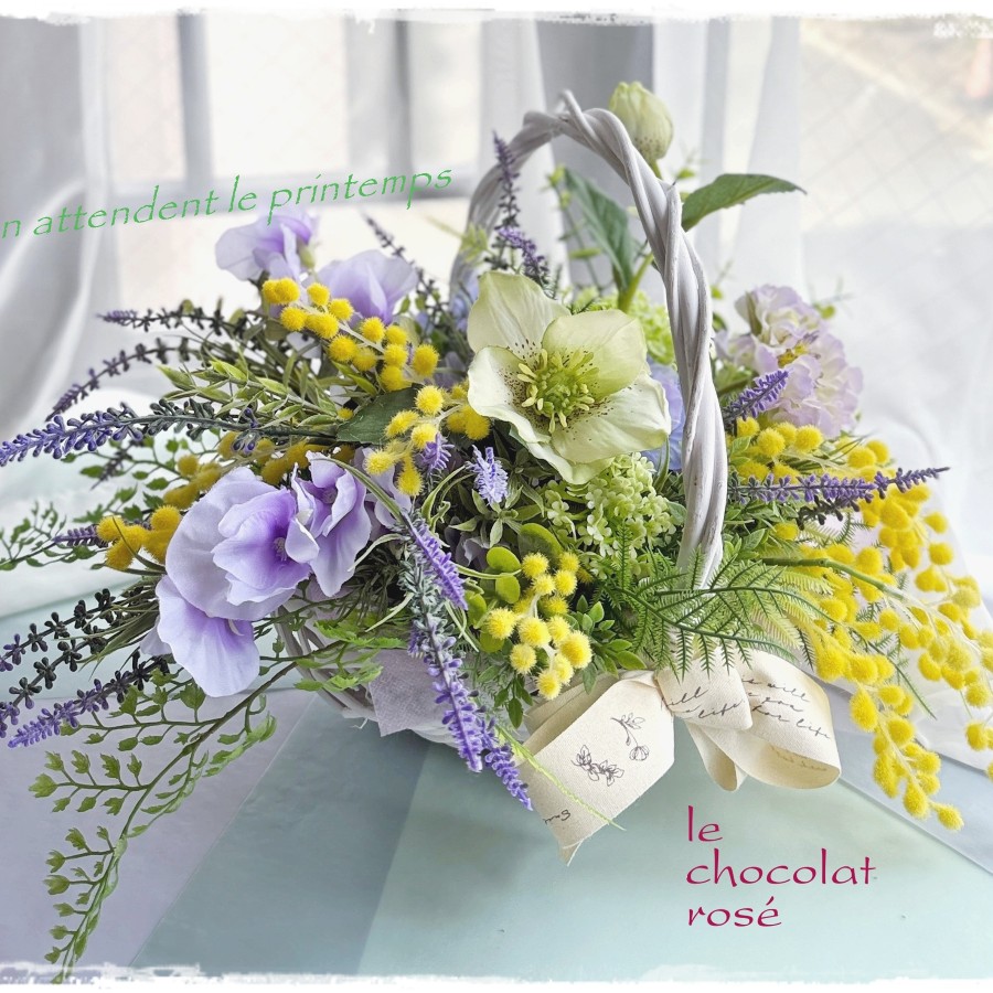 ミモザとラベンダーをバスケットからあふれるように入れて