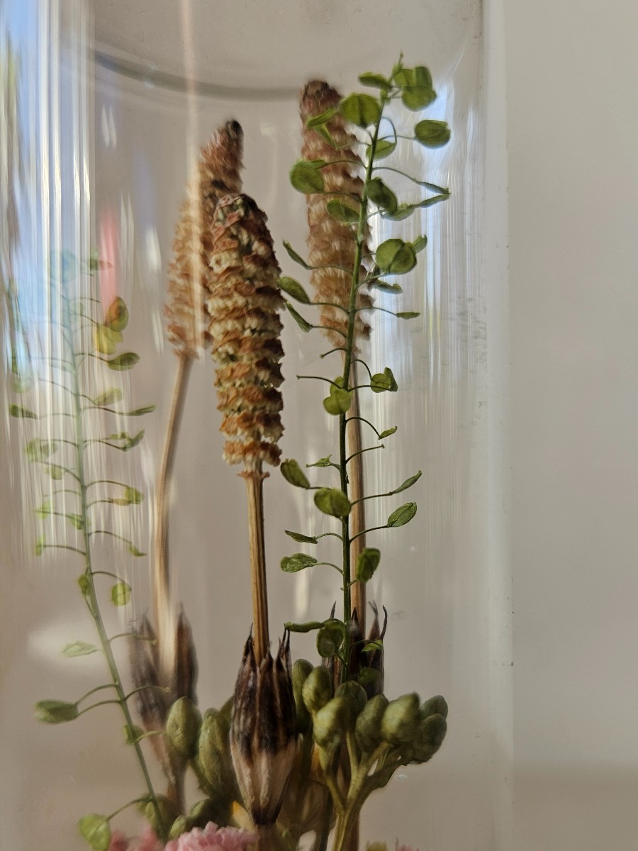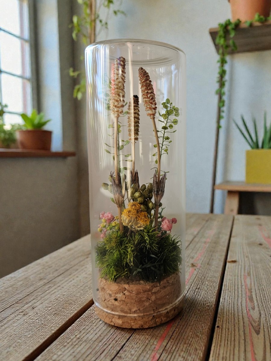 小さなボトルにドライのつくしやコケを閉じ込めたアレンジメントです。