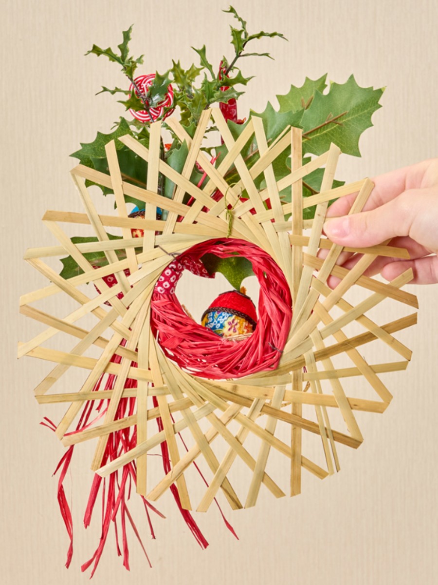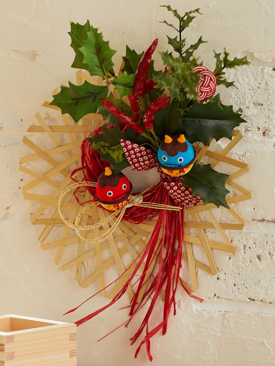 アレンジのデザインはお正月飾りにも使え、ピックや小物を変えれば節分まで飾れるアレンジです。