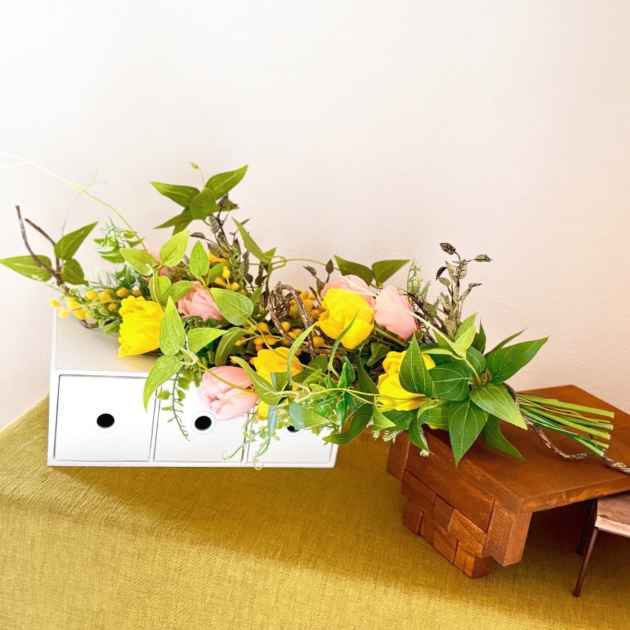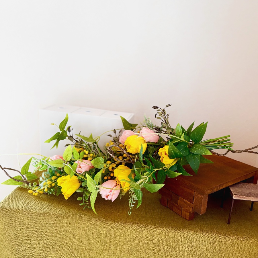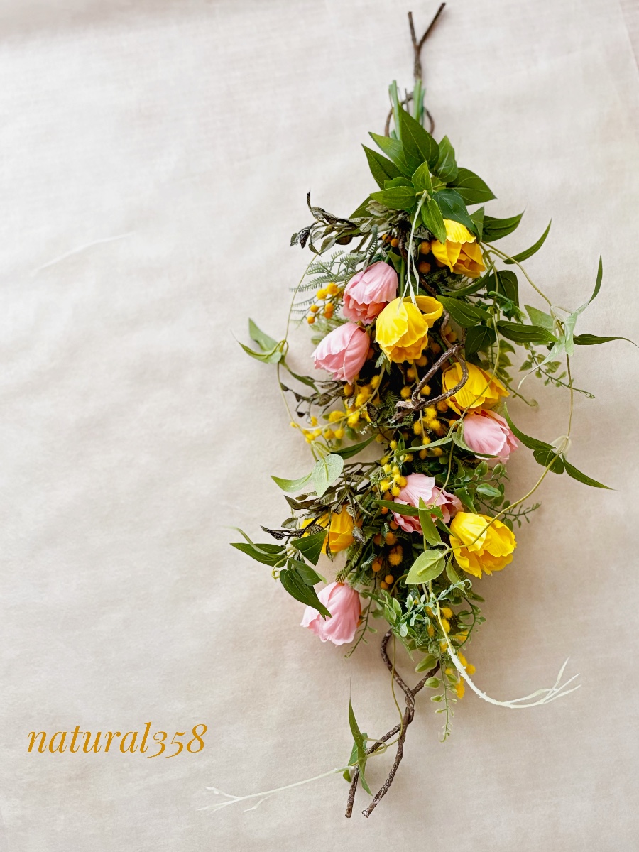 チューリップやミモザであしらった2wayスタイルの飾りです。上下を入れ替えて好みの形で楽しめます。