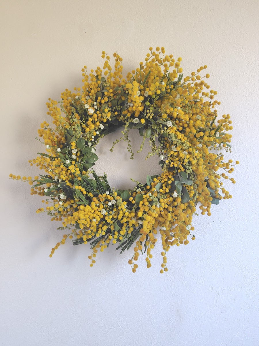 イタリアから届いた色鮮やかなミランドールと、開花を待つ蕾のパールアカシア、小さな花姿が可憐なカスミソウ…それぞれの素材の良さを生かし、シンプルに仕上げました。