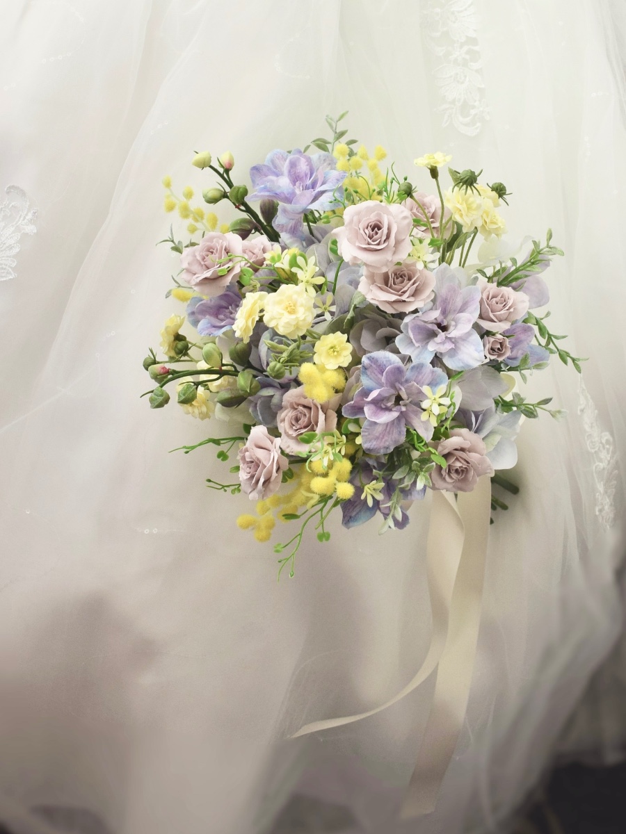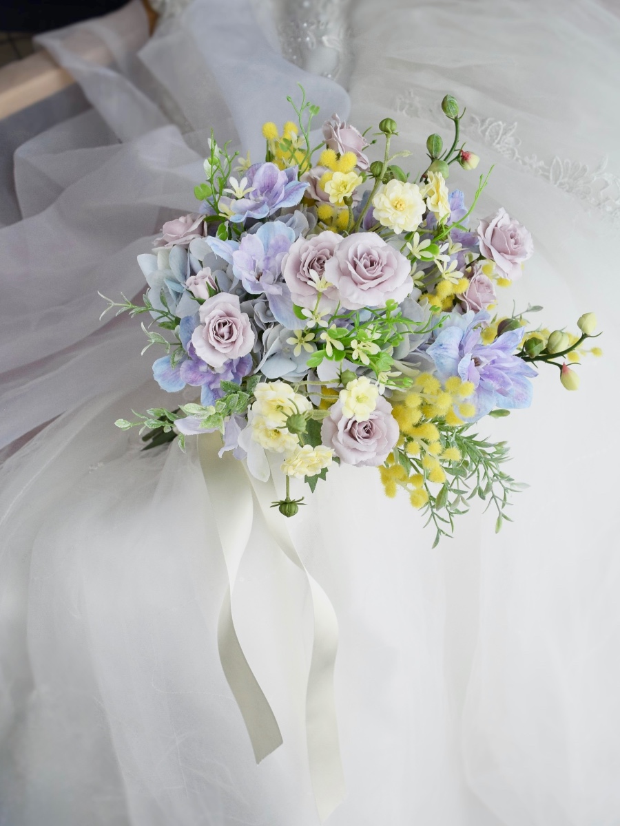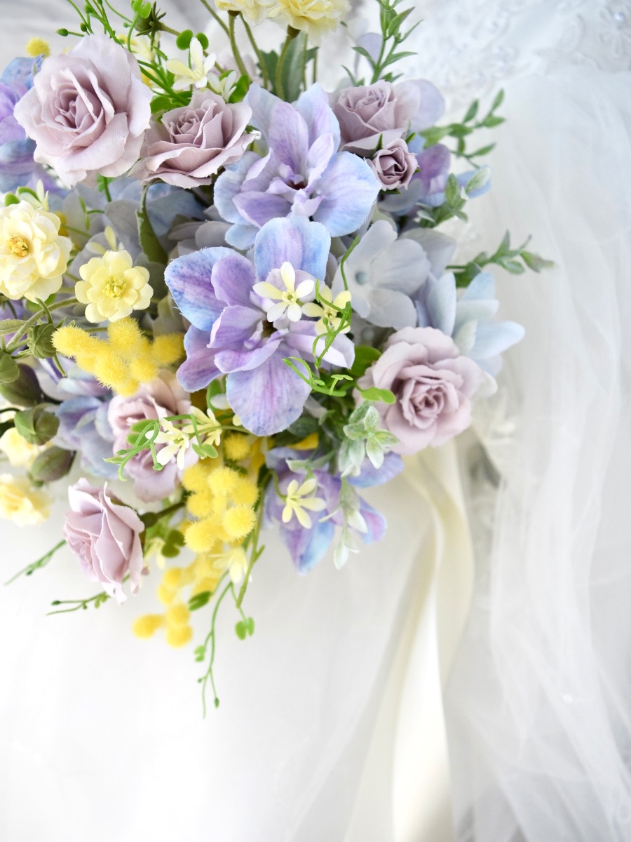 イエローとブルーラベンダーを組み合わせた春のラウンドブーケです。空気感をもたせてラフに束ねました。飛び出した小花やリーフが可愛らしく揺れます。