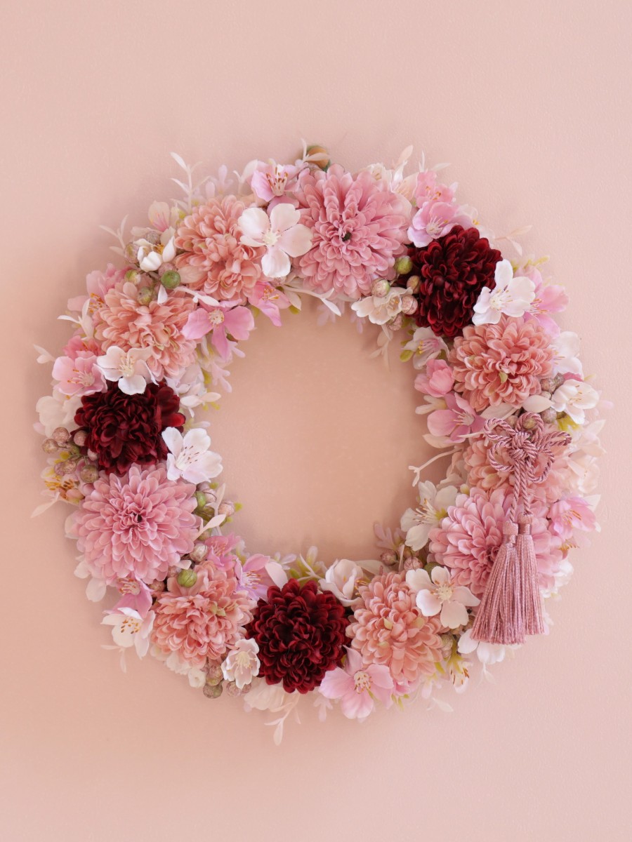ボールマムと桜三種を贅沢に合わせた和風リースです。