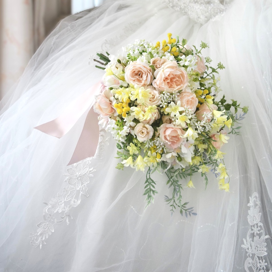 淡いイエローとオレンジの組み合わせのスプリングブーケ。軽やかなグリーンや繊細な茎の小花が揺れて…。