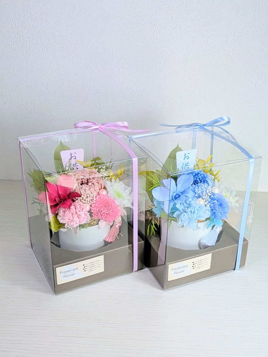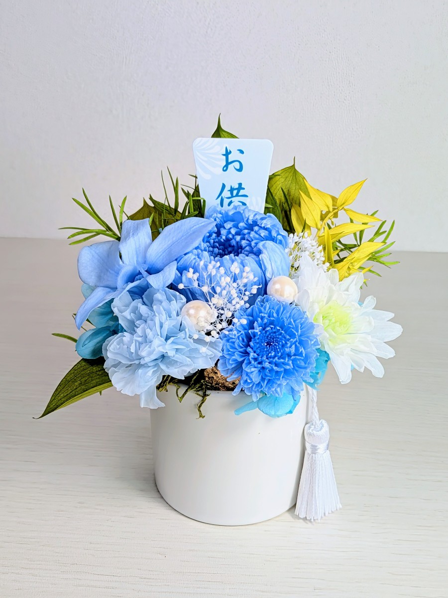 プリザーブドフラワーで作成し春らしい可愛いブルーのお供え仏花です。沢山の菊やカーネーションなどを使用しています。
