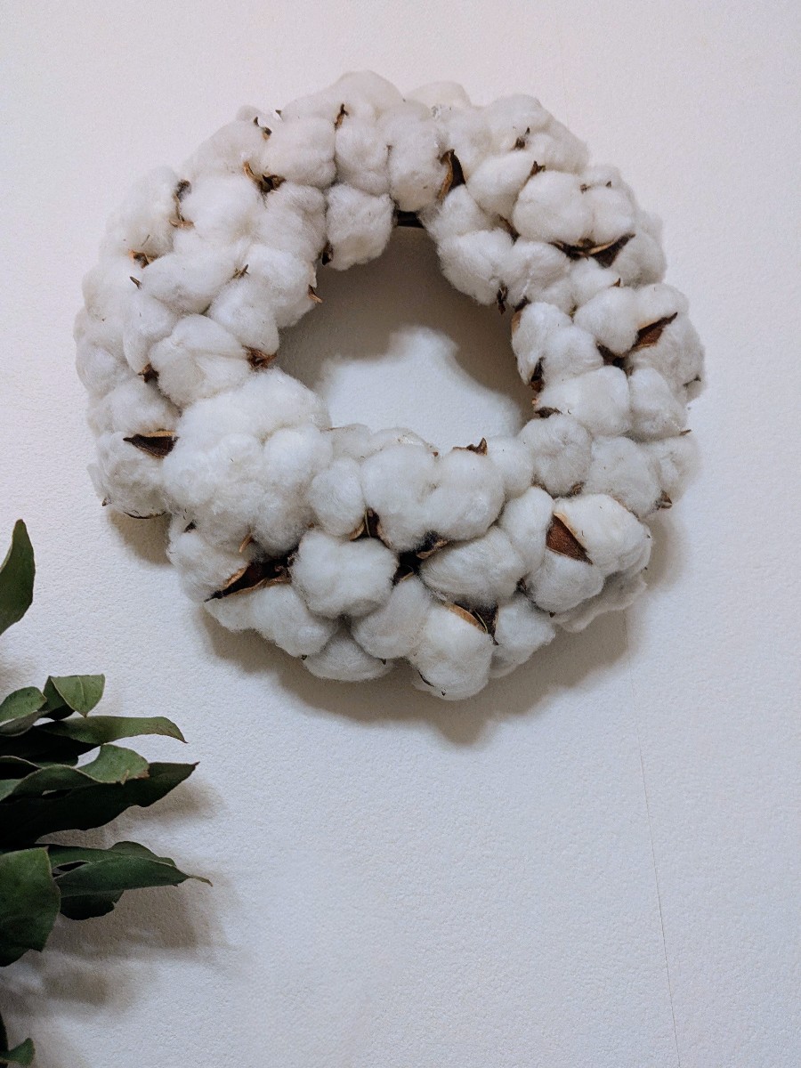 綿の実をぎっしりつけたふわふわもこもこのリースです。