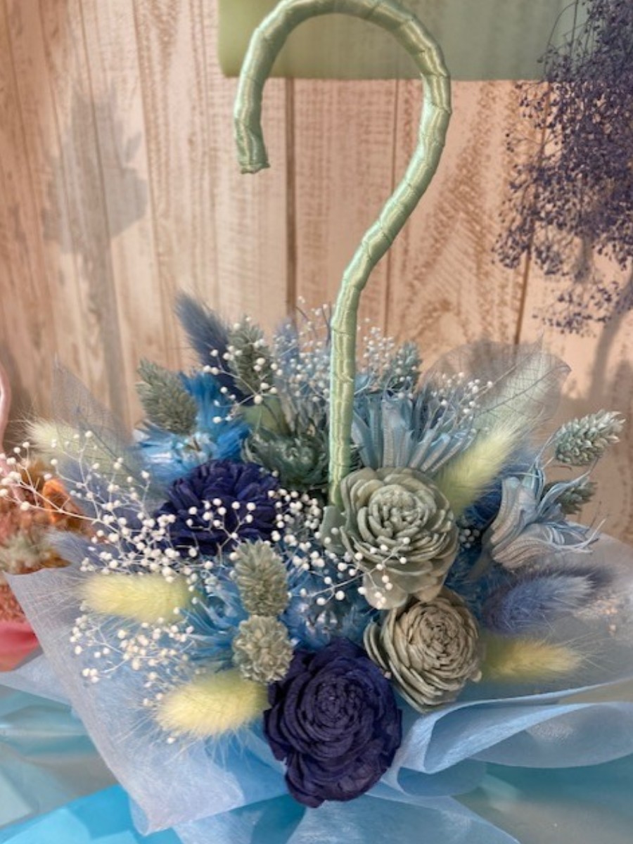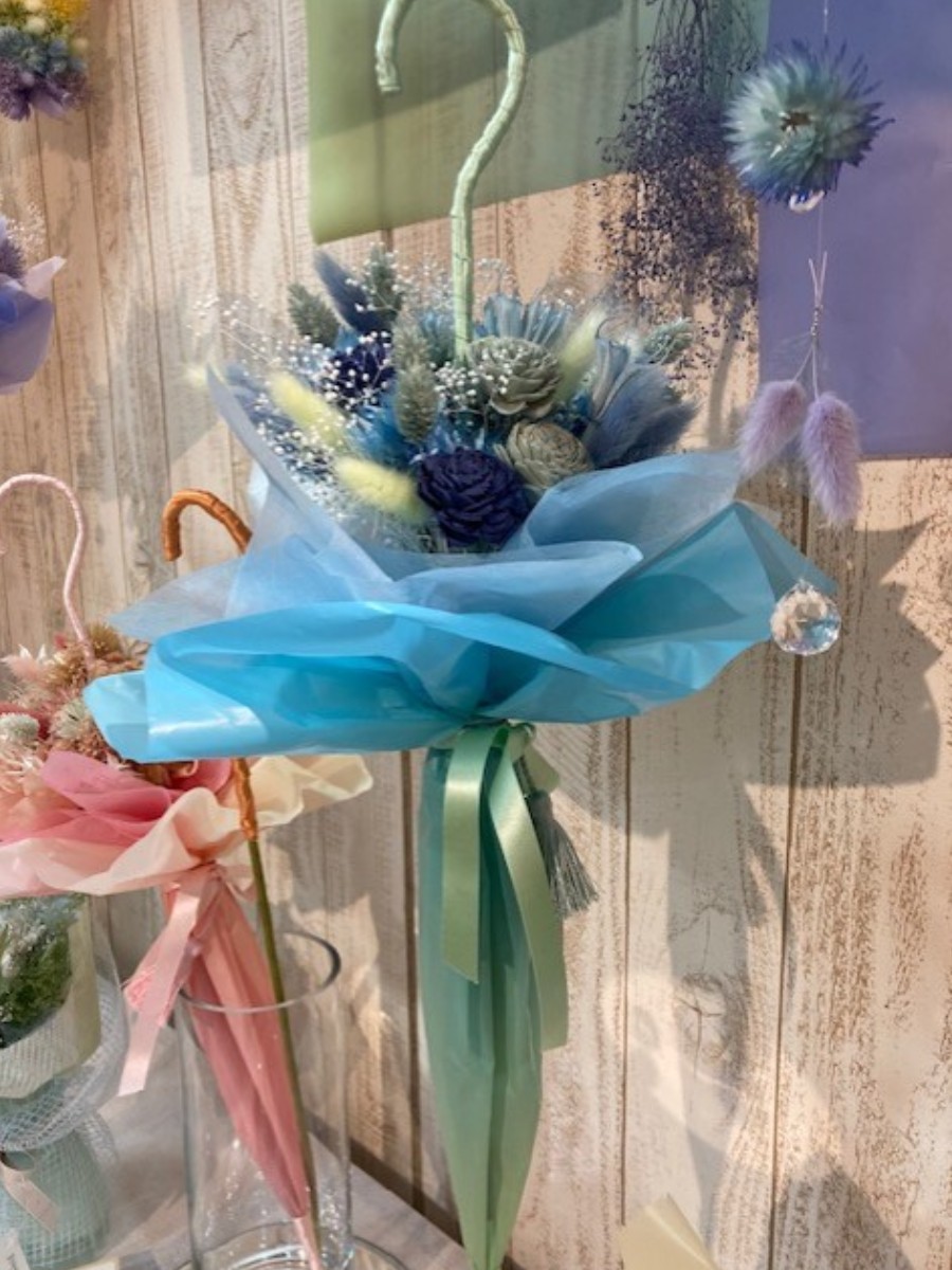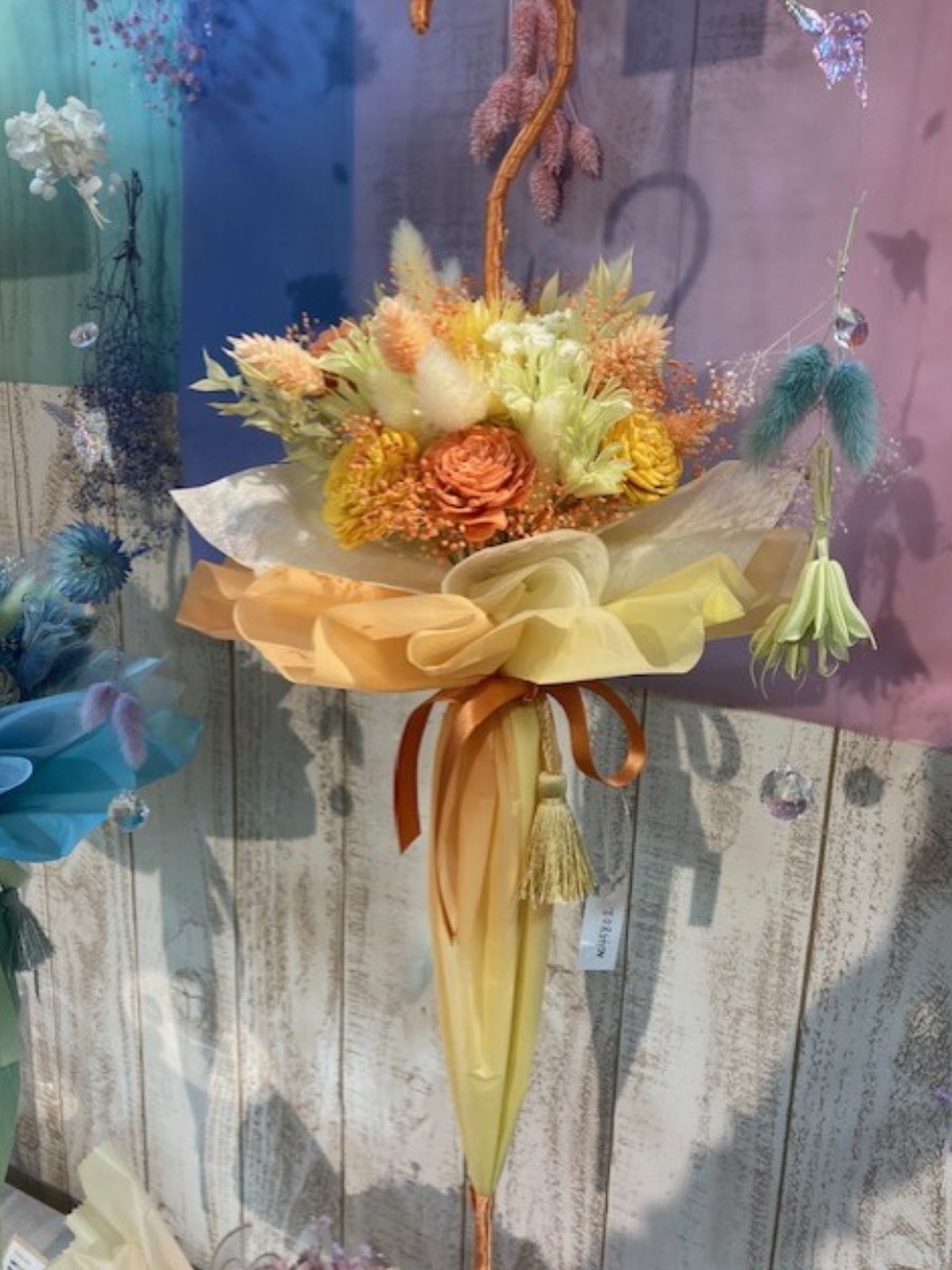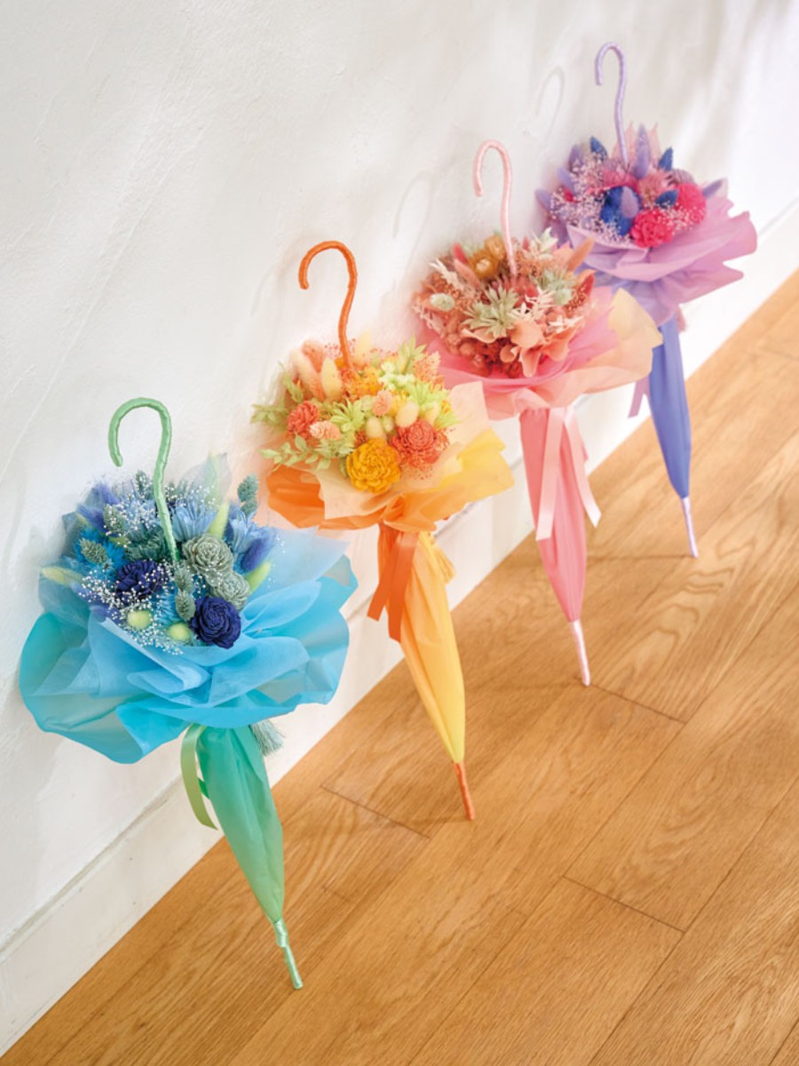 その中心に傘の軸を通して花束を包んでいます。
