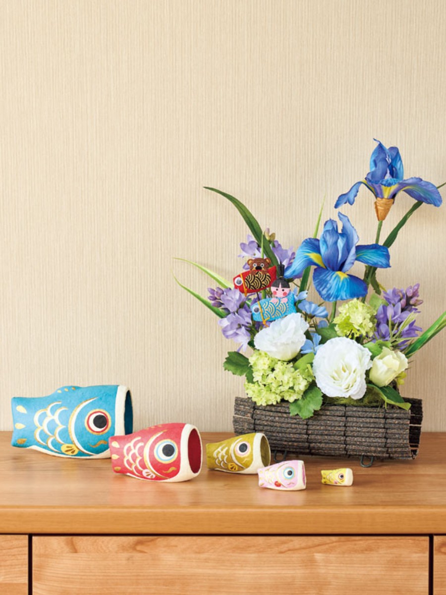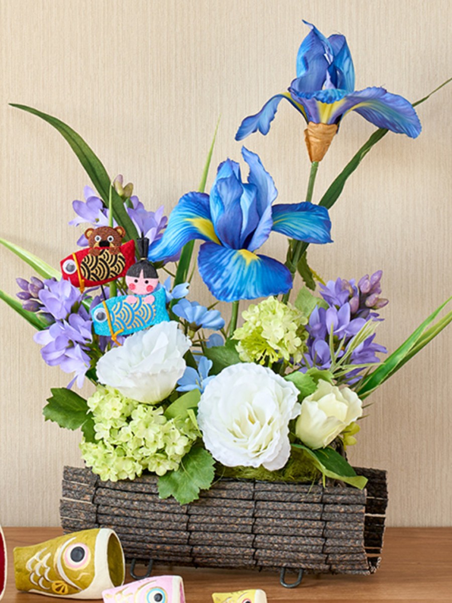 青や紫・グリーンで合わせてこどもの日にぴったりのさわやかな印象でアレンジしました。