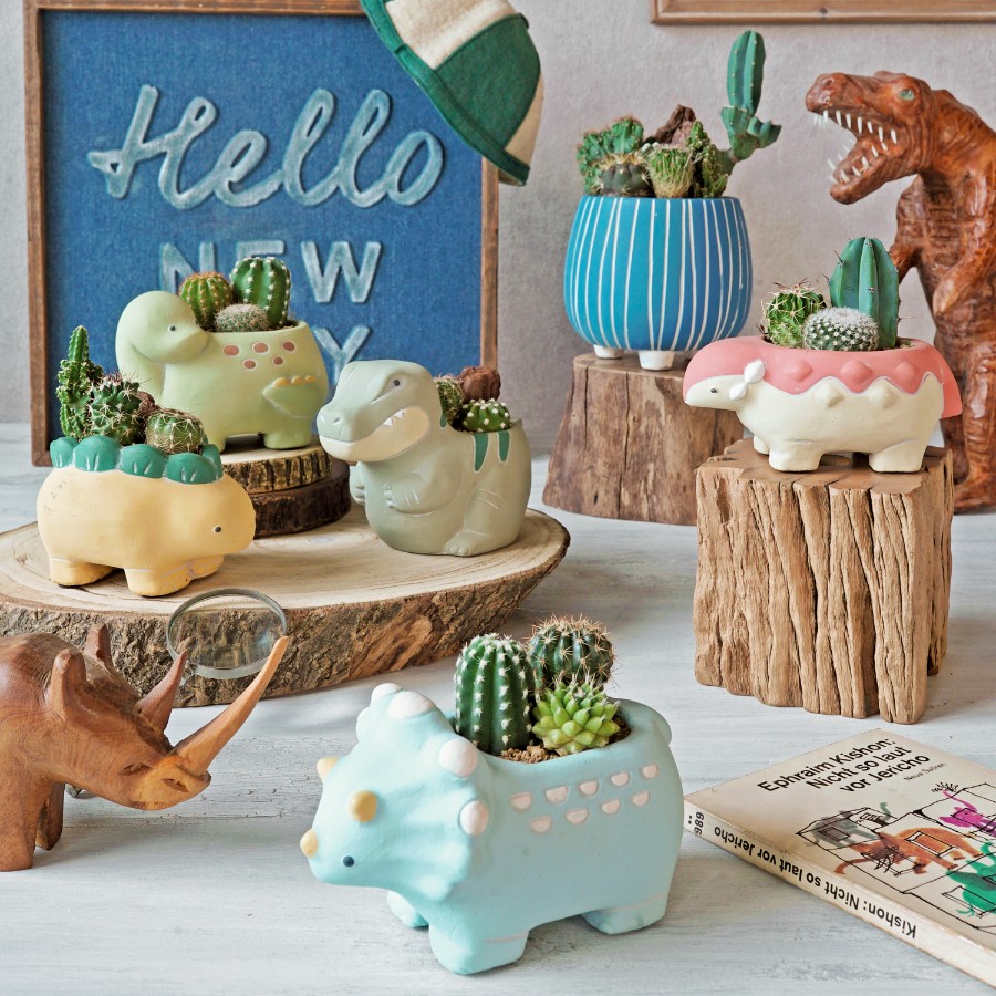可愛い恐竜モチーフのセメント製の鉢。