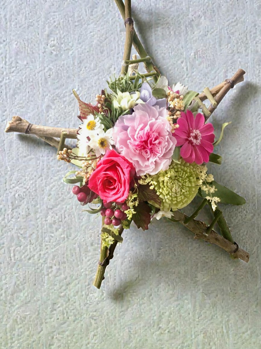 星形に組んだ枝のベースに、華やかなプリザーブドフラワーをあしらった個性的な壁飾りです。