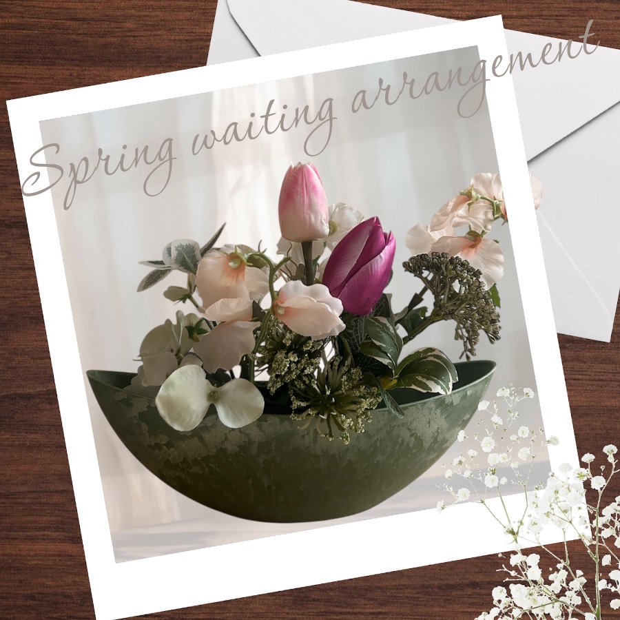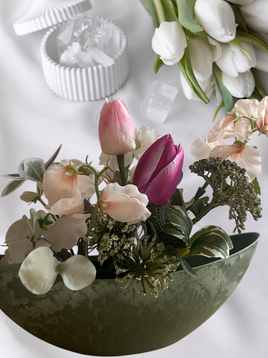 セイジカラーの舟形の花器に