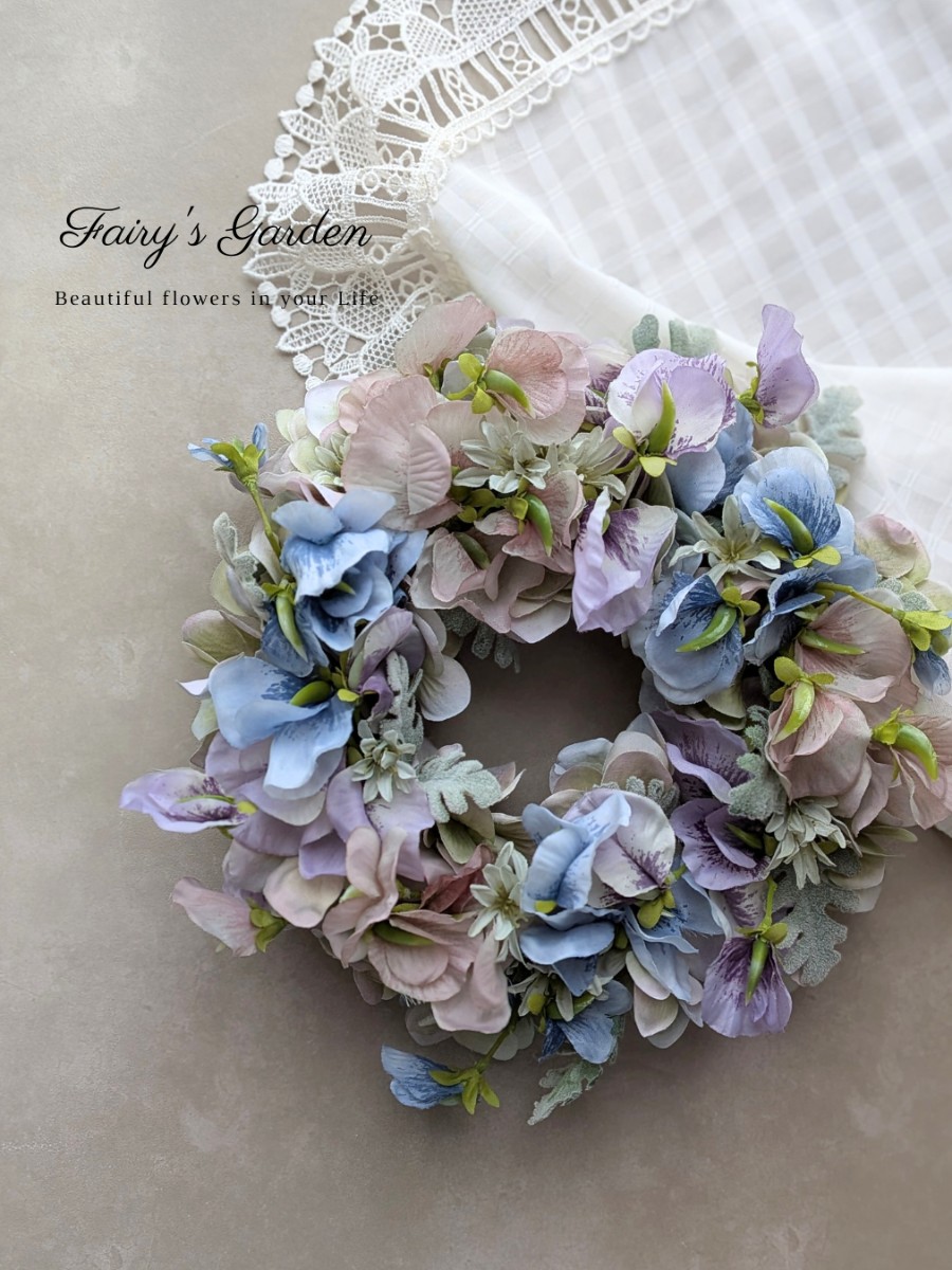 スイートピーと紫陽花をたっぷり詰め込んだリースは大人色。