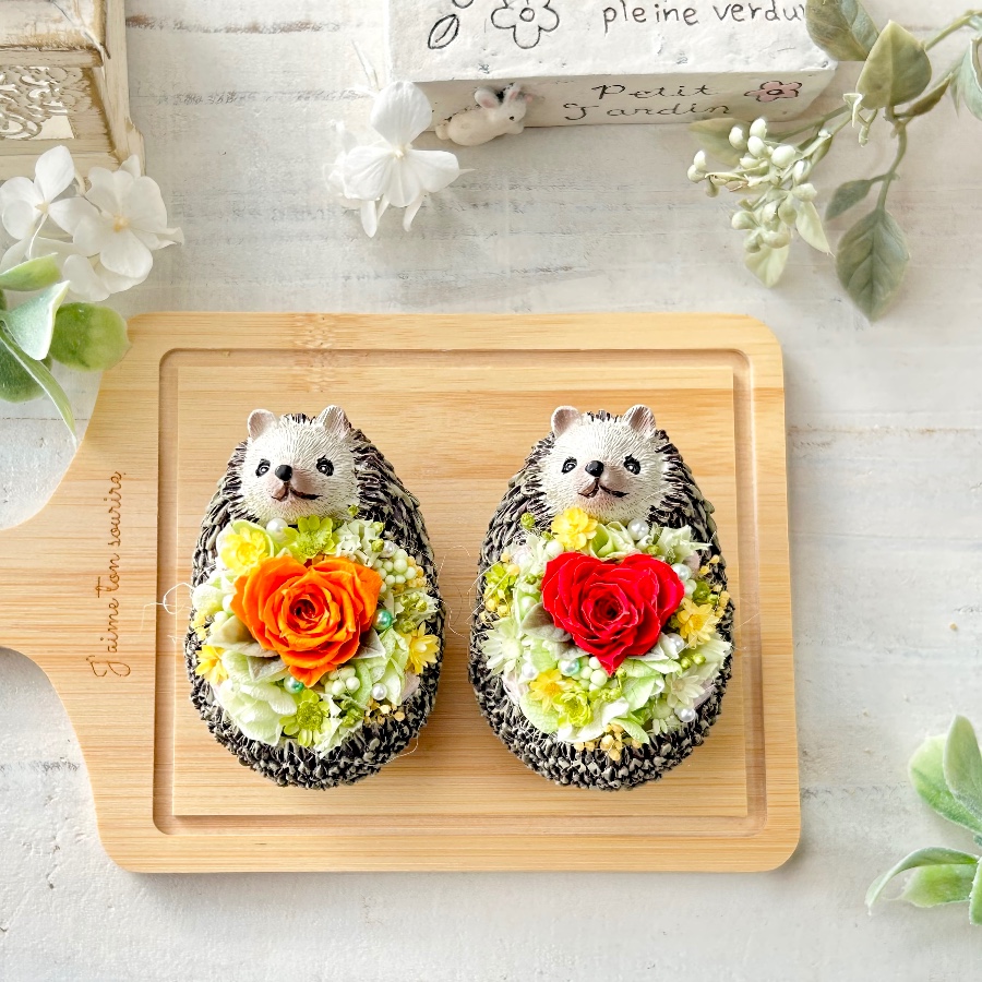 小さなハリネズミのポットを使ったフラワーアレンジです。