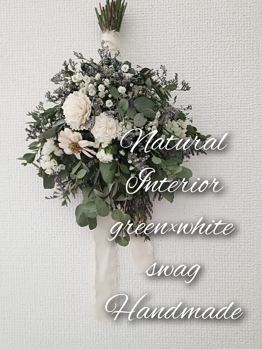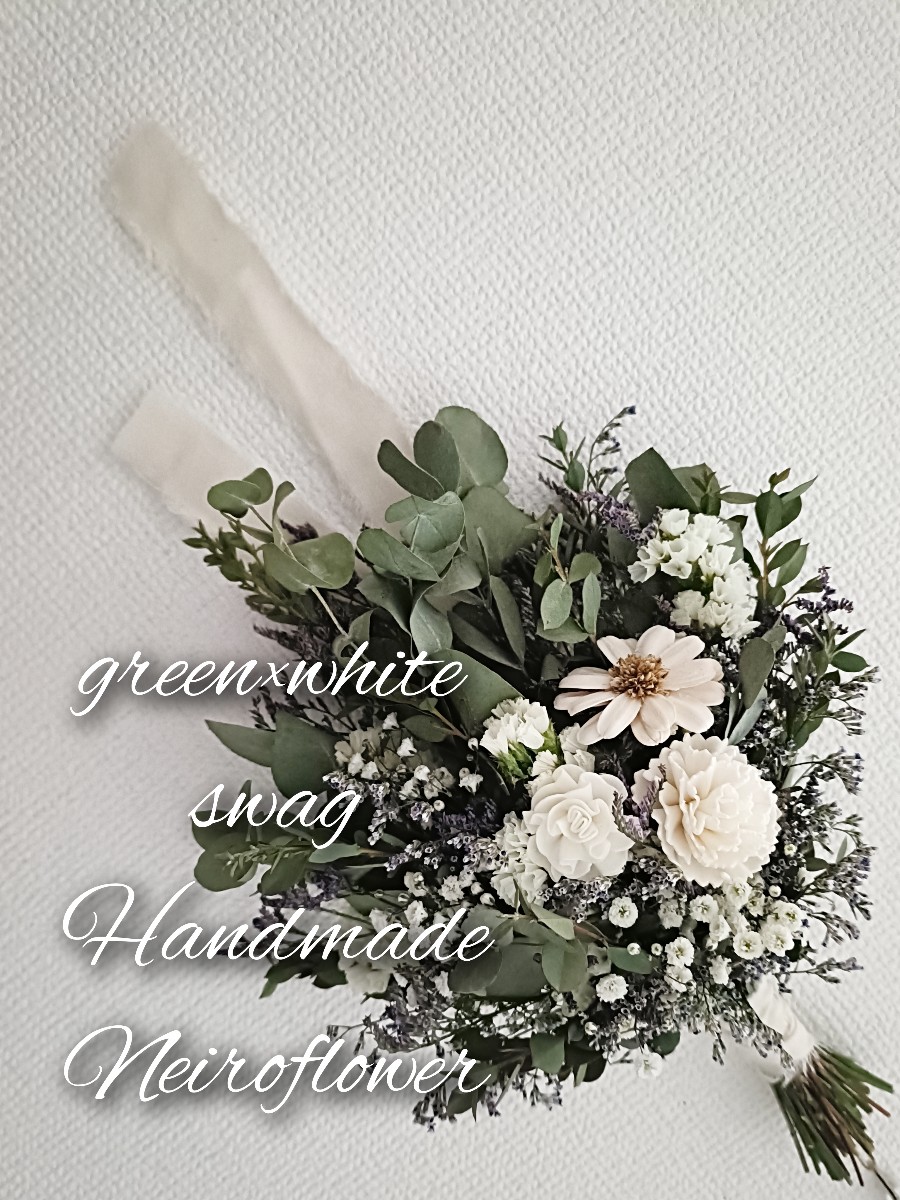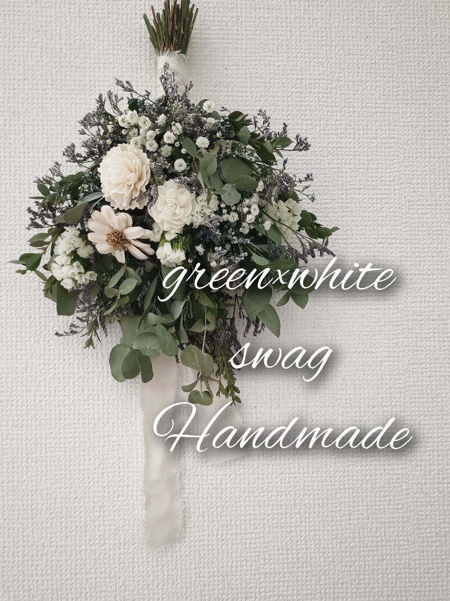 ユーカリのかすみ草のシンプルながら可愛らしい一面もある、グリーン×ホワイトスワッグです(*^^*)