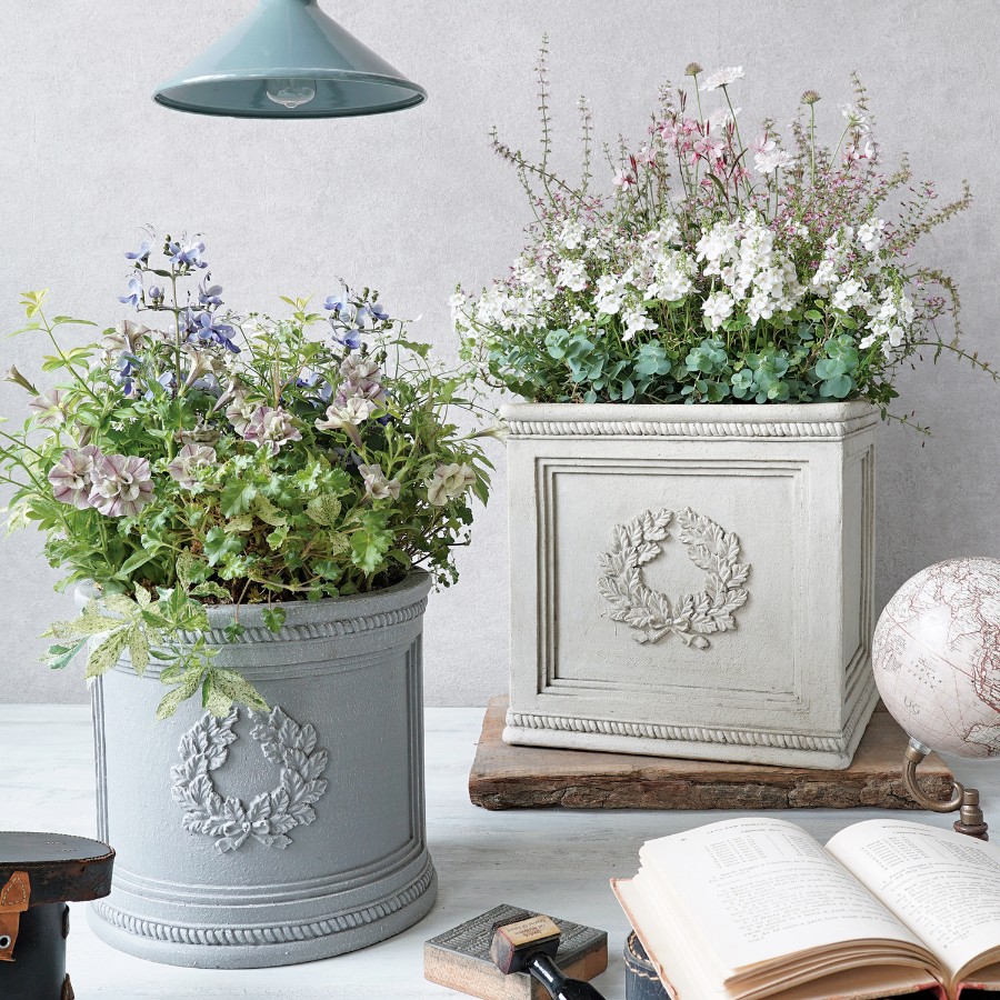 リースレリーフが印象的なグラスファイバー製の鉢。