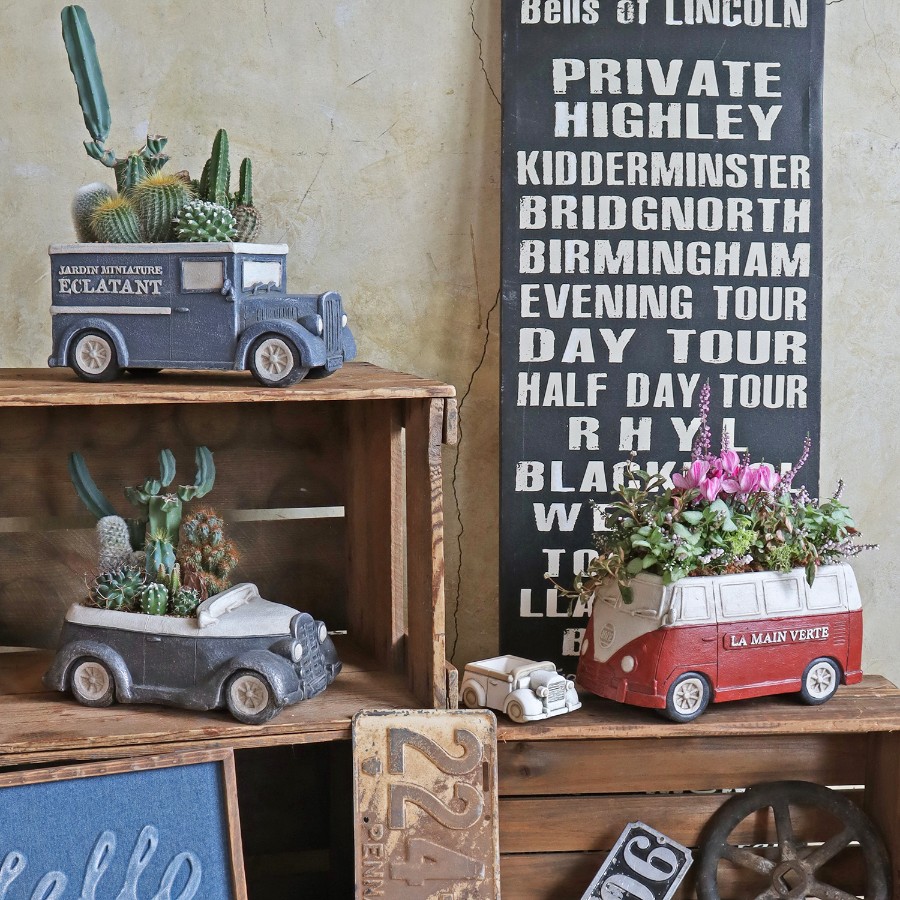クラシックカーモチーフのグラスファイバー製の鉢。