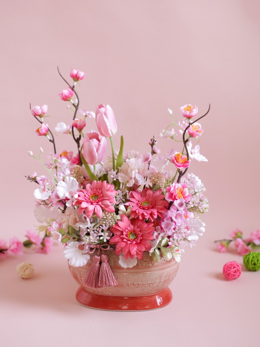 花桃と蝶のように舞うオンシジウムが節句の春を華やかに彩る和モダンアレンジメントです。チューリップやガーベラ、桜など春のお花をたっぷりあしらって明るくて可愛い雰囲気に仕上げました。