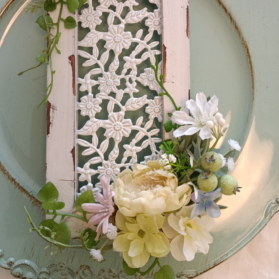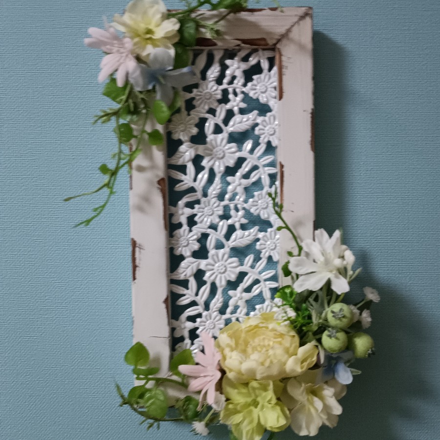 おしゃれなホワイトウッドフレームに、アーティフィシャルフラワーでアレンジしました。
