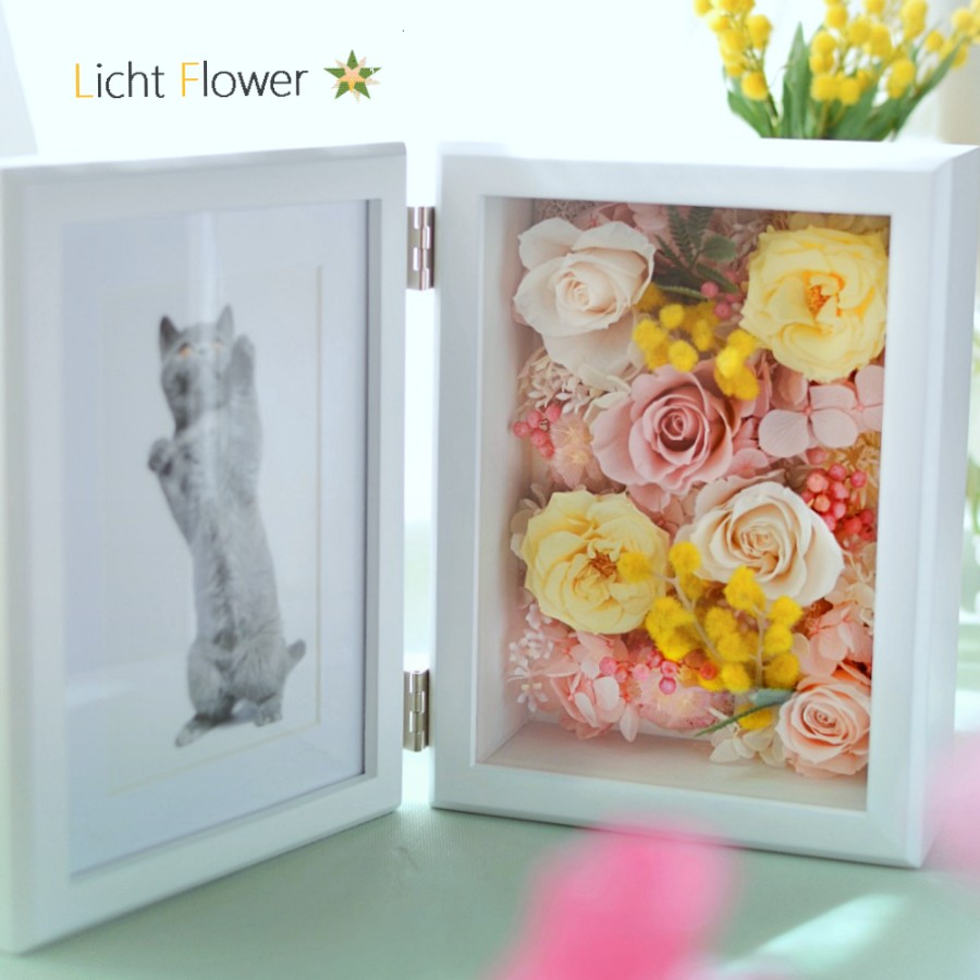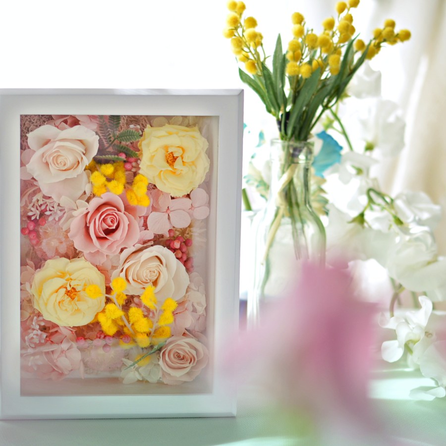 フレームの中は春爛漫♪パステルピンクとミモザのフォトフレームです。
