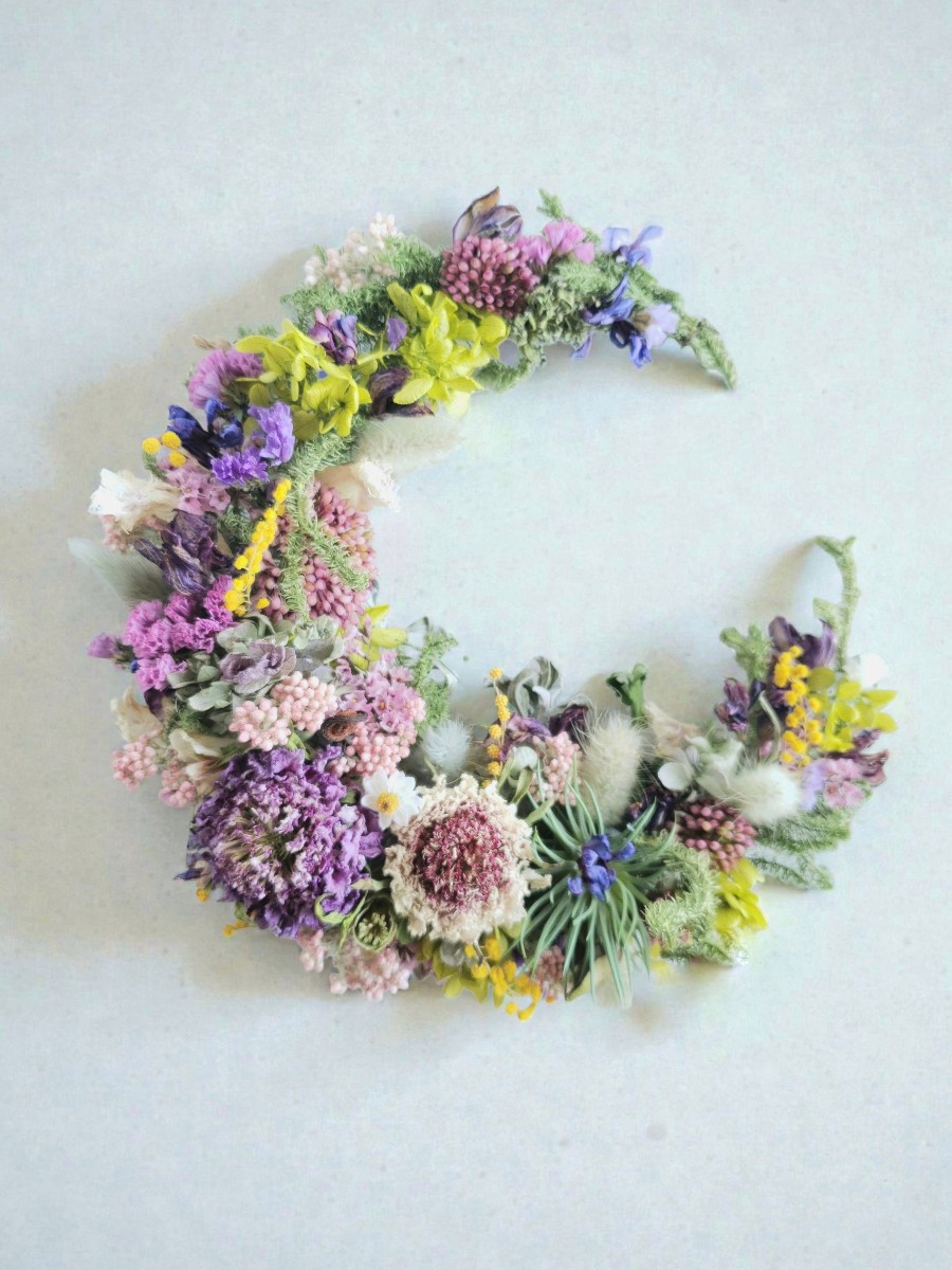 ドライフラワーのスカビオサをメインに、春らしい柔らかい色合いのドライフラワー、プリザーブドフラワー、アーティフィシャルフラワーを使用した三日月リースです。