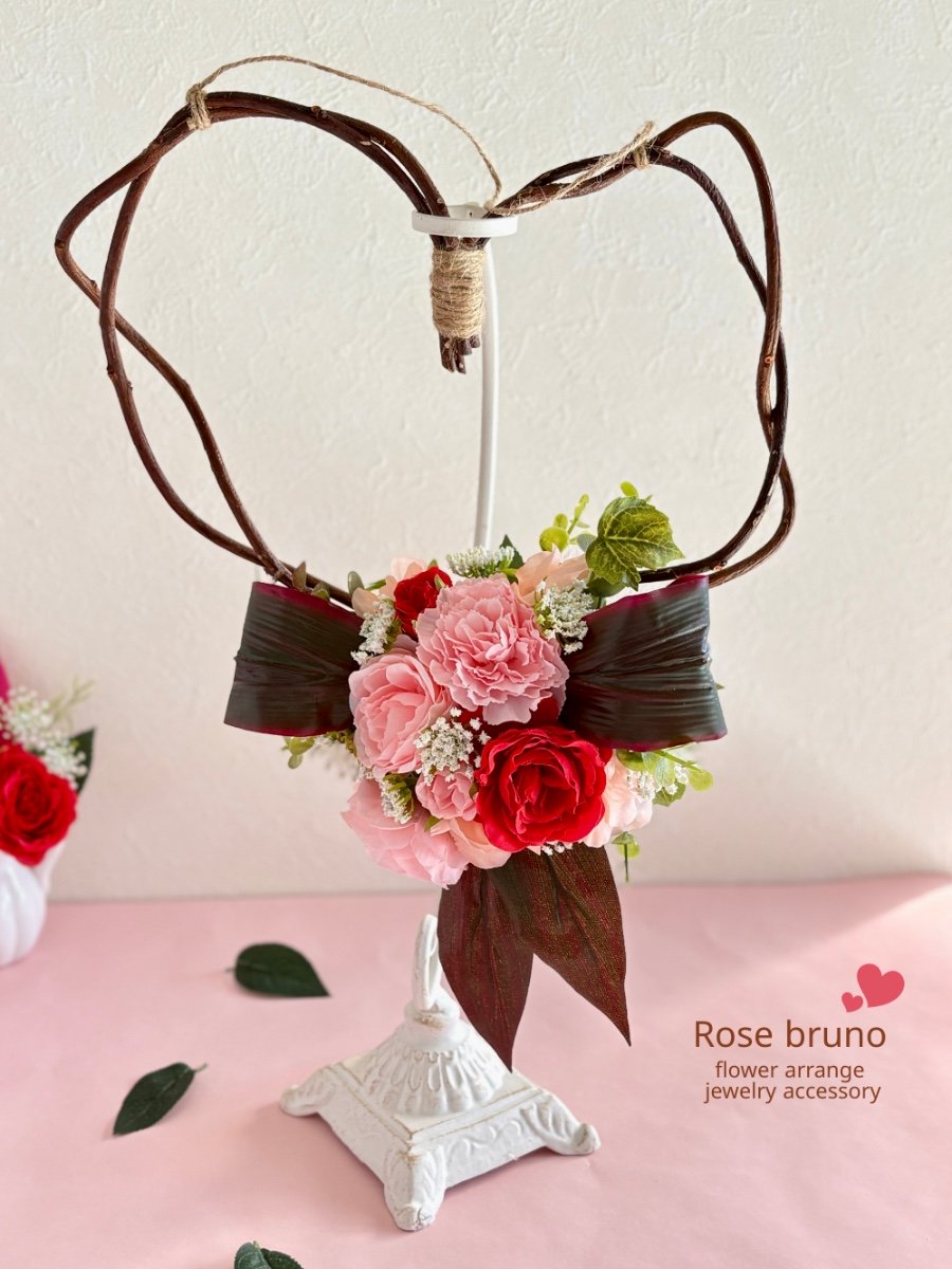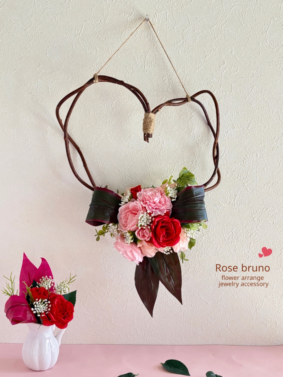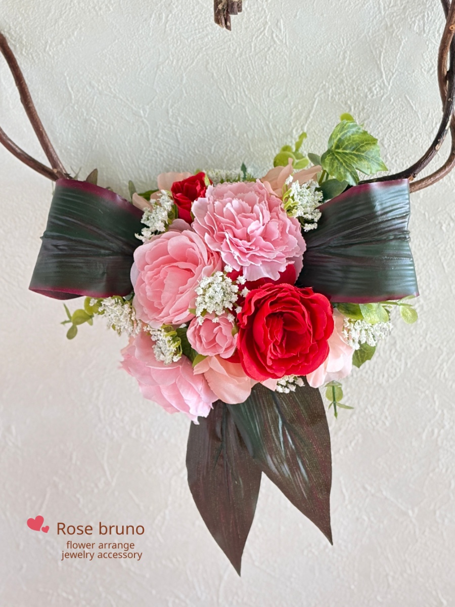 ロマンチックな印象の赤やピンクの花々をアカヅルでハート型に組んだベースにアレンジしたリースになります♡