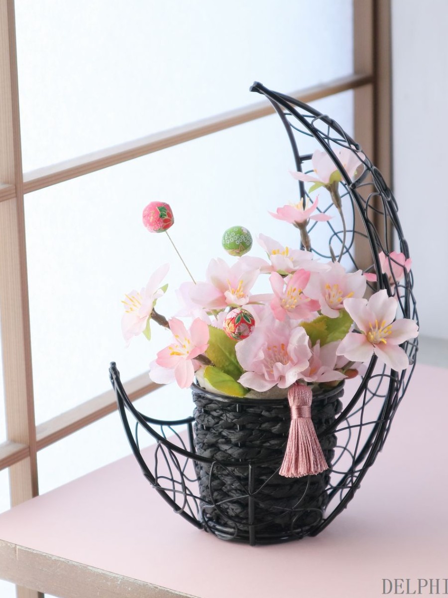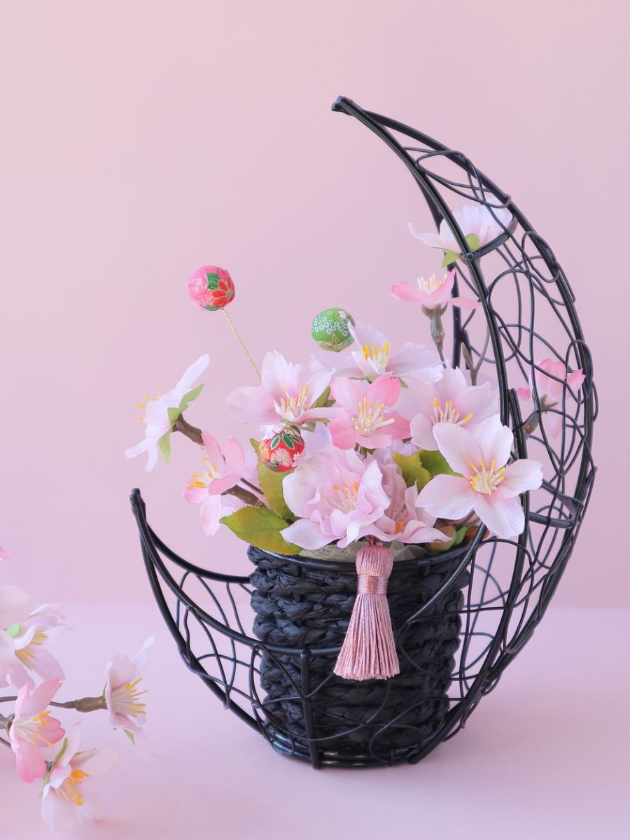 三日月型のアイアン製のモダンな花器に、2種類の桜を使用した春のアレンジメントです。