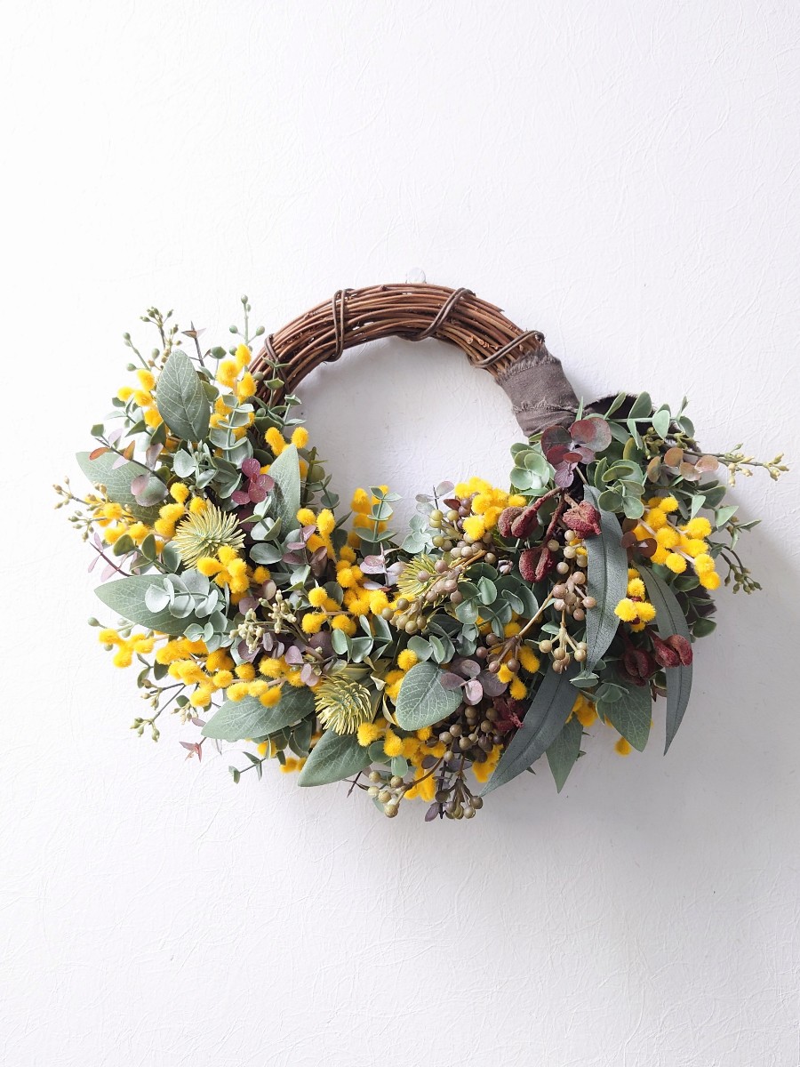 ミモザにユーカリを合わせて、シックだけど可愛いリースを作りました。