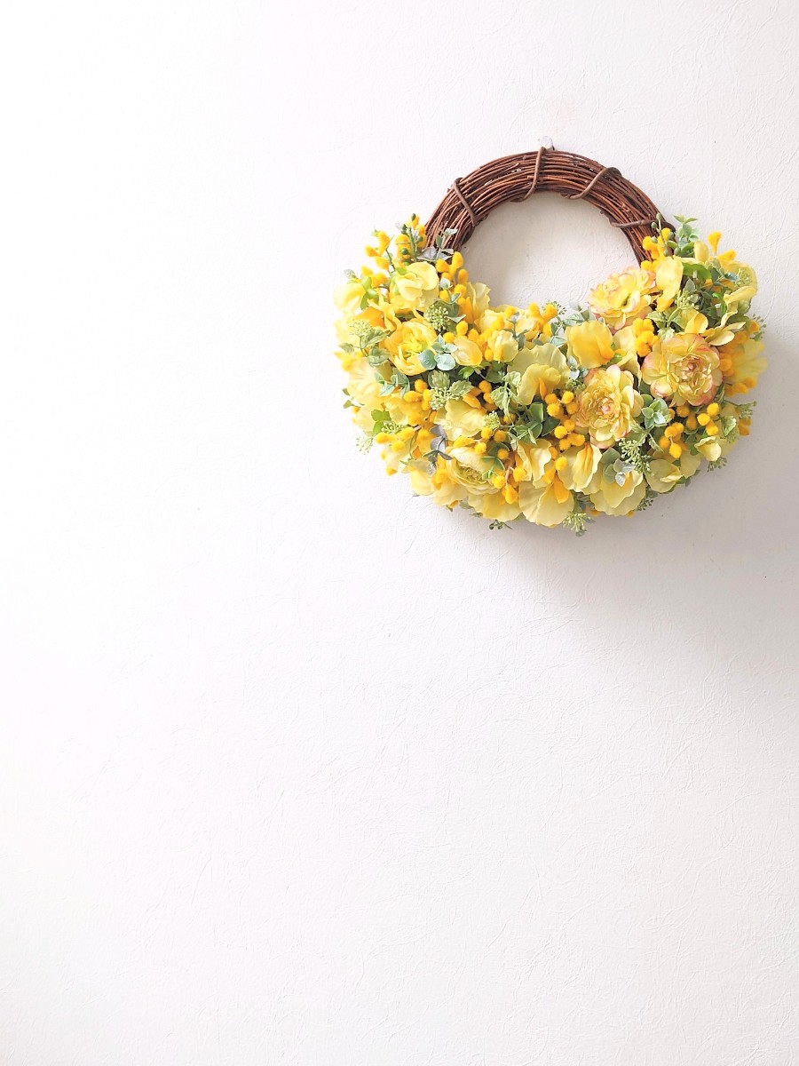 ミモザ、スイトピー、ラナンキュラス、という春を代表すお花でたち、春の陽だまりのようなリースをお作りしました。