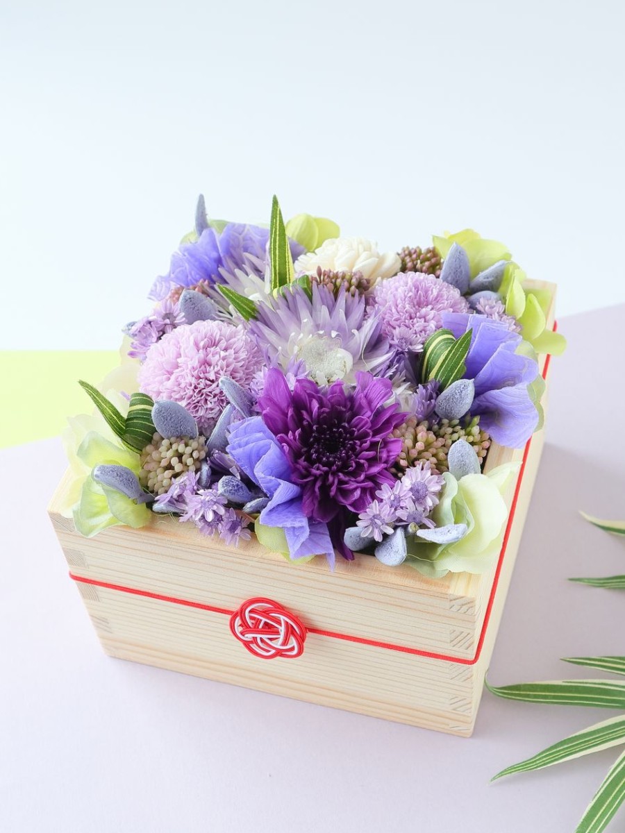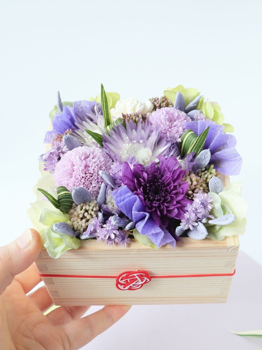 木製の升の中にポンポンマムやことね菊、シルバーデージーなどの紫色の花々を集めたプリザーブドフラワーアレンジメントです。