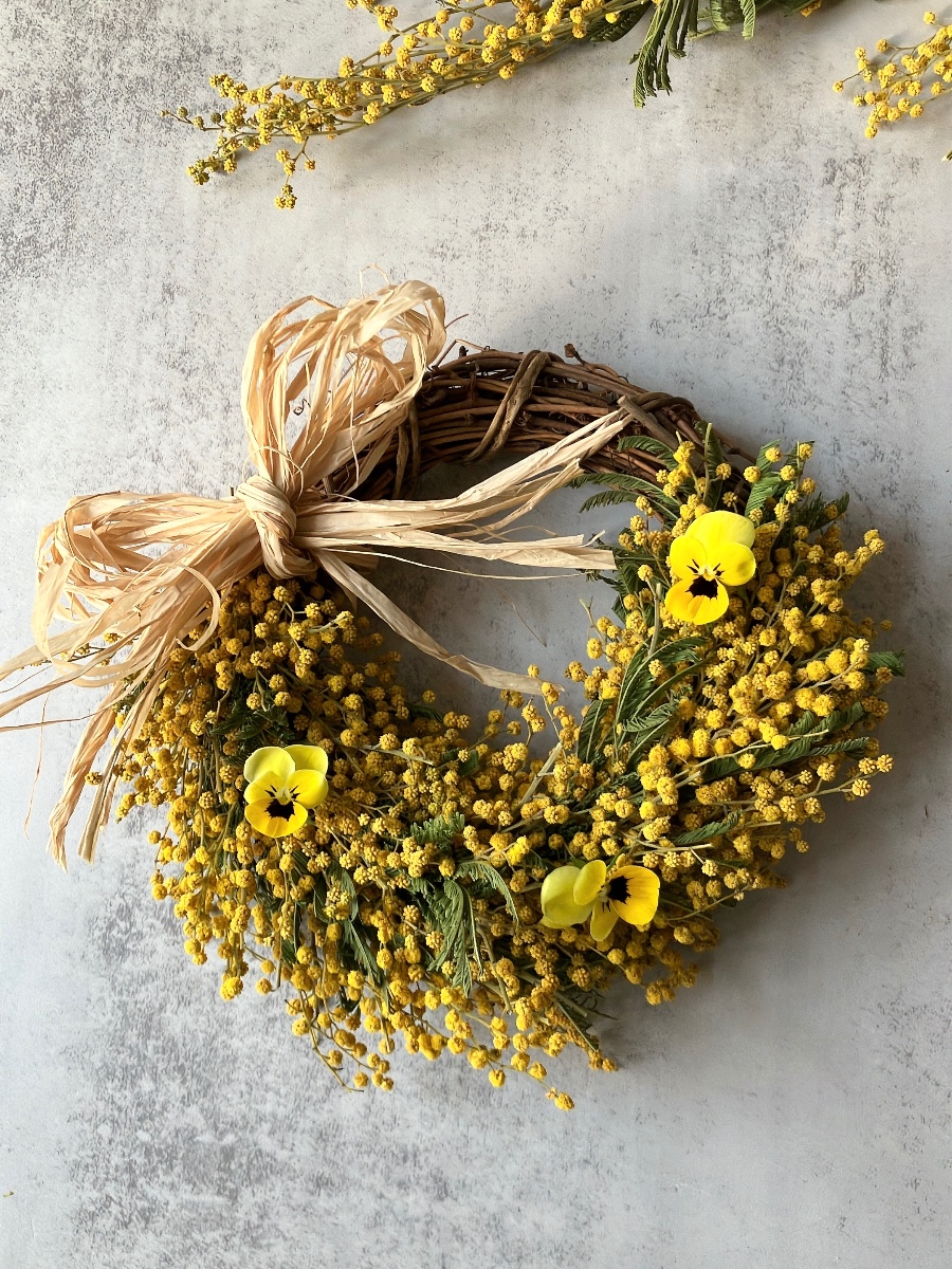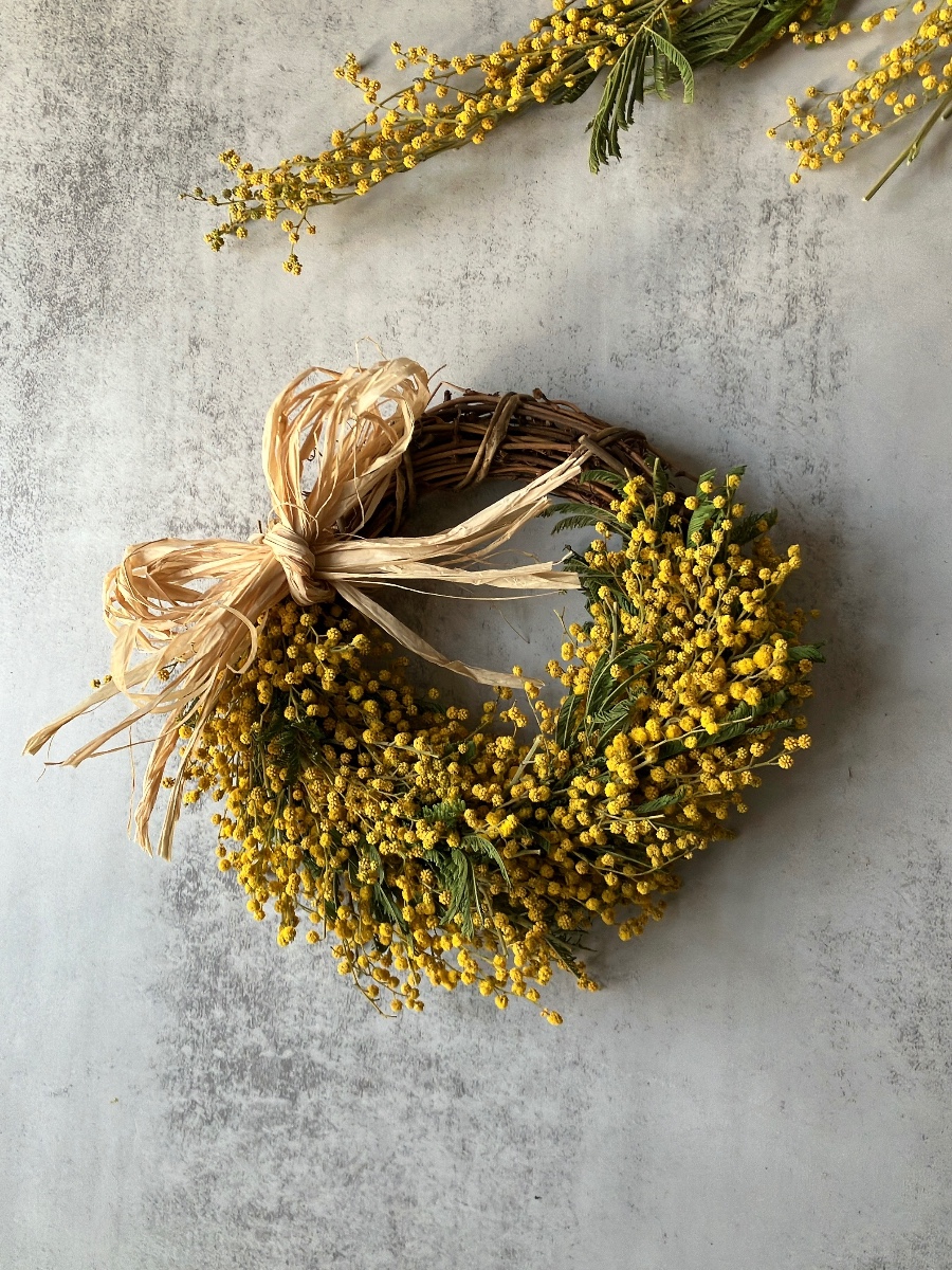 ミモザが大好きで、店頭より早くフレッシュリースが作りたかったので、はなどんやさんのキットを購入して作りました。