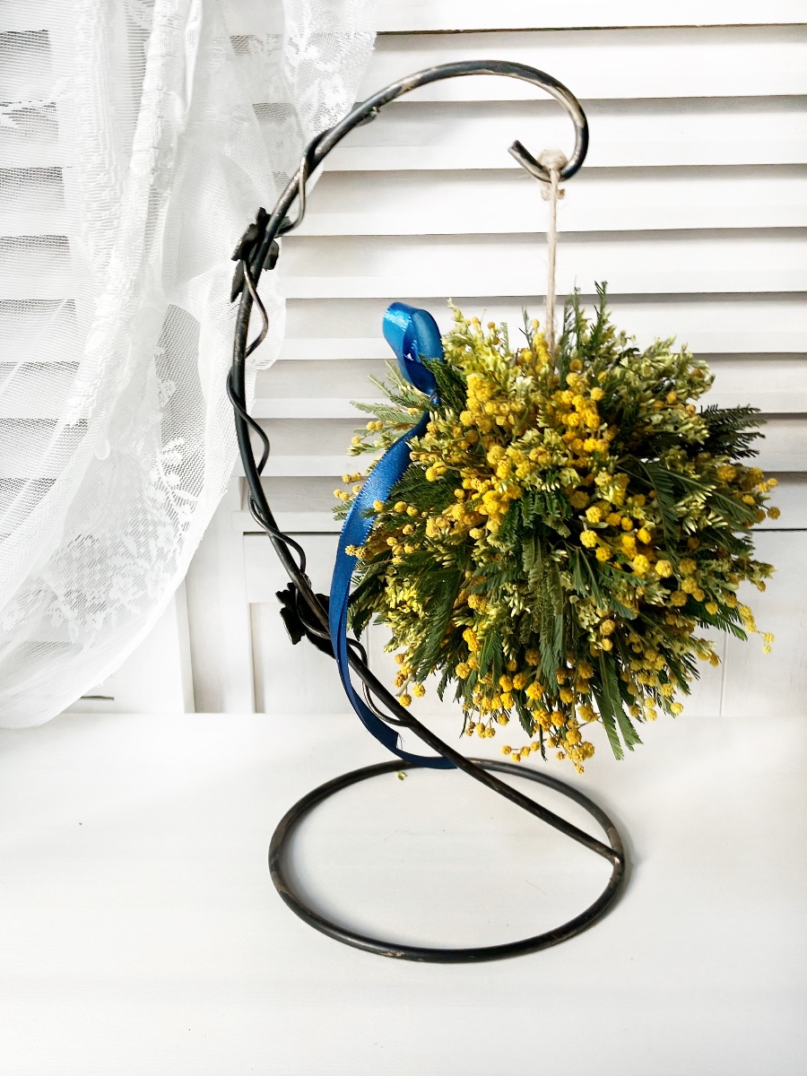 フレッシュミモザとスターチスのフラワーハンギングボールです。